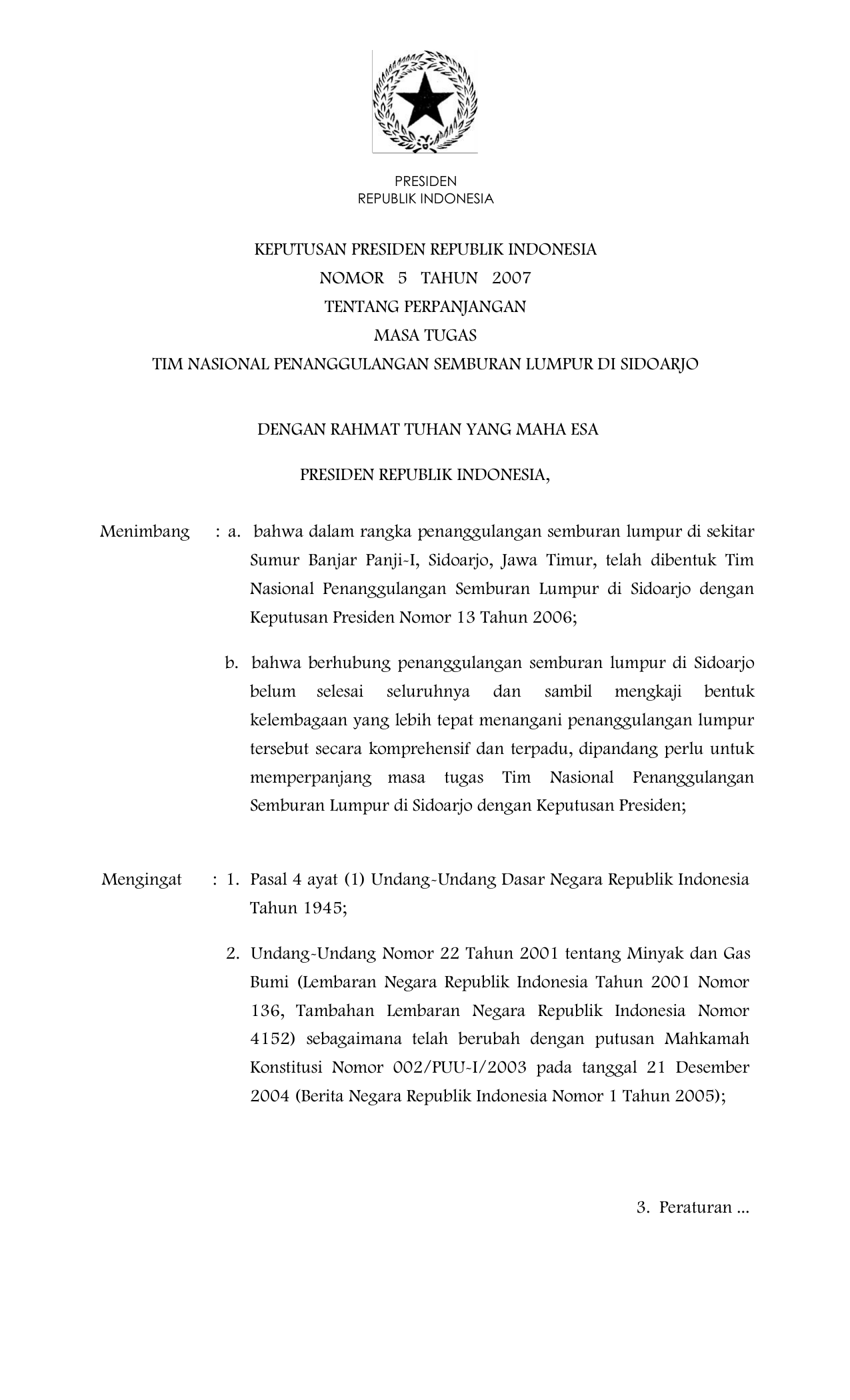 KEPPRES Nomor 5 Tahun 2007 | Keputusan Presiden Nomor 5 Tahun 2007 tentang PERPANJANGAN MASA TUGAS TIM NASIONAL PENANGGULANGAN SEMBURAN LUMPUR DI SIDOARJO