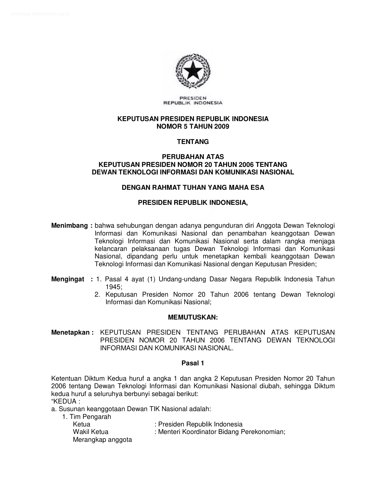 KEPPRES Nomor 5 Tahun 2009 | Keputusan Presiden Nomor 5 Tahun 2009 tentang PERUBAHAN KEPPRES 20-2006 TENTANG DEWAN TEKNOLOGI INFORMASI DAN KOMUNIKASI NASIONAL