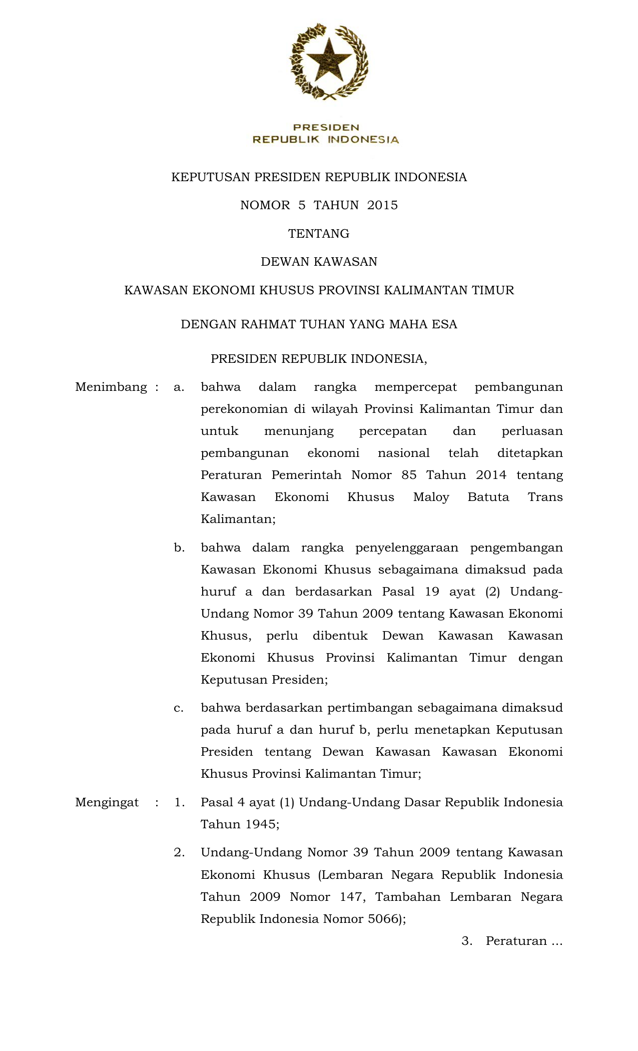 KEPPRES Nomor 5 Tahun 2015 | Keputusan Presiden Nomor 5 Tahun 2015 tentang DEWAN KAWASAN KAWASAN EKONOMI KHUSUS PROVINSI KALIMANTAN TIMUR