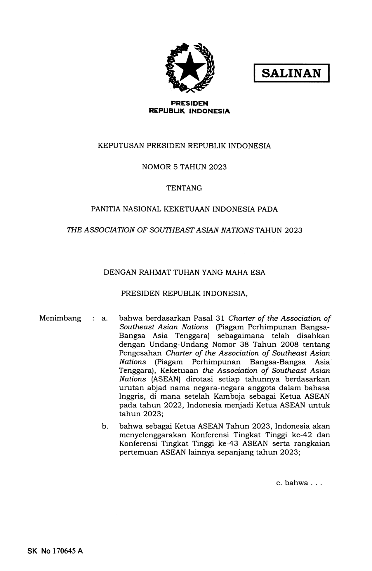 KEPPRES Nomor 5 Tahun 2023 | Keputusan Presiden Nomor 5 Tahun 2023 tentang PANITIA NASIONAL KEKETUAAN INDONESIA PADATHE ASSOCIATION OF SOUTHEAST ASIAN NATIONS TAHUN 2023