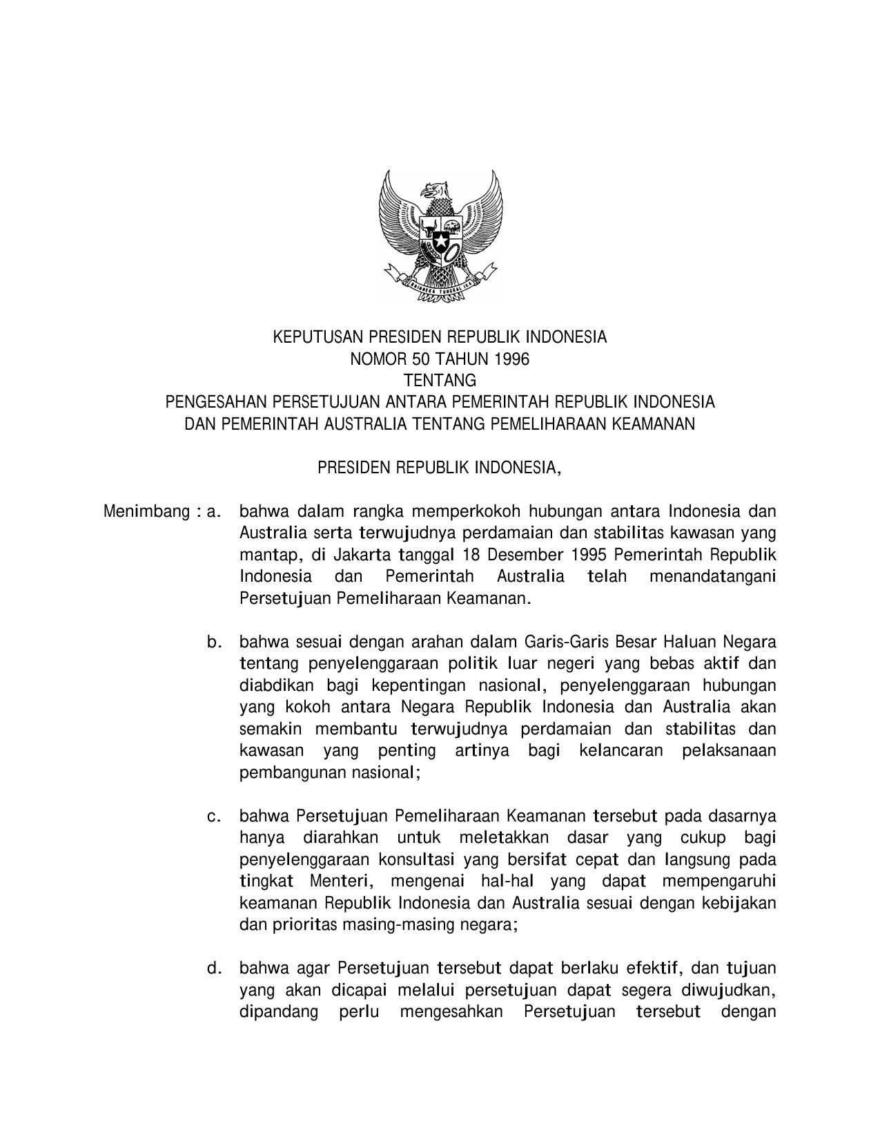 KEPPRES Nomor 50 Tahun 1996 | Keputusan Presiden Nomor 50 Tahun 1996 tentang PENGESAHAN PERSETUJUAN ANTARA PEMERINTAH RI DAN PEMERINTAH AUSTRALIA TENTANG PEMELIHARAAN KEAMANAN