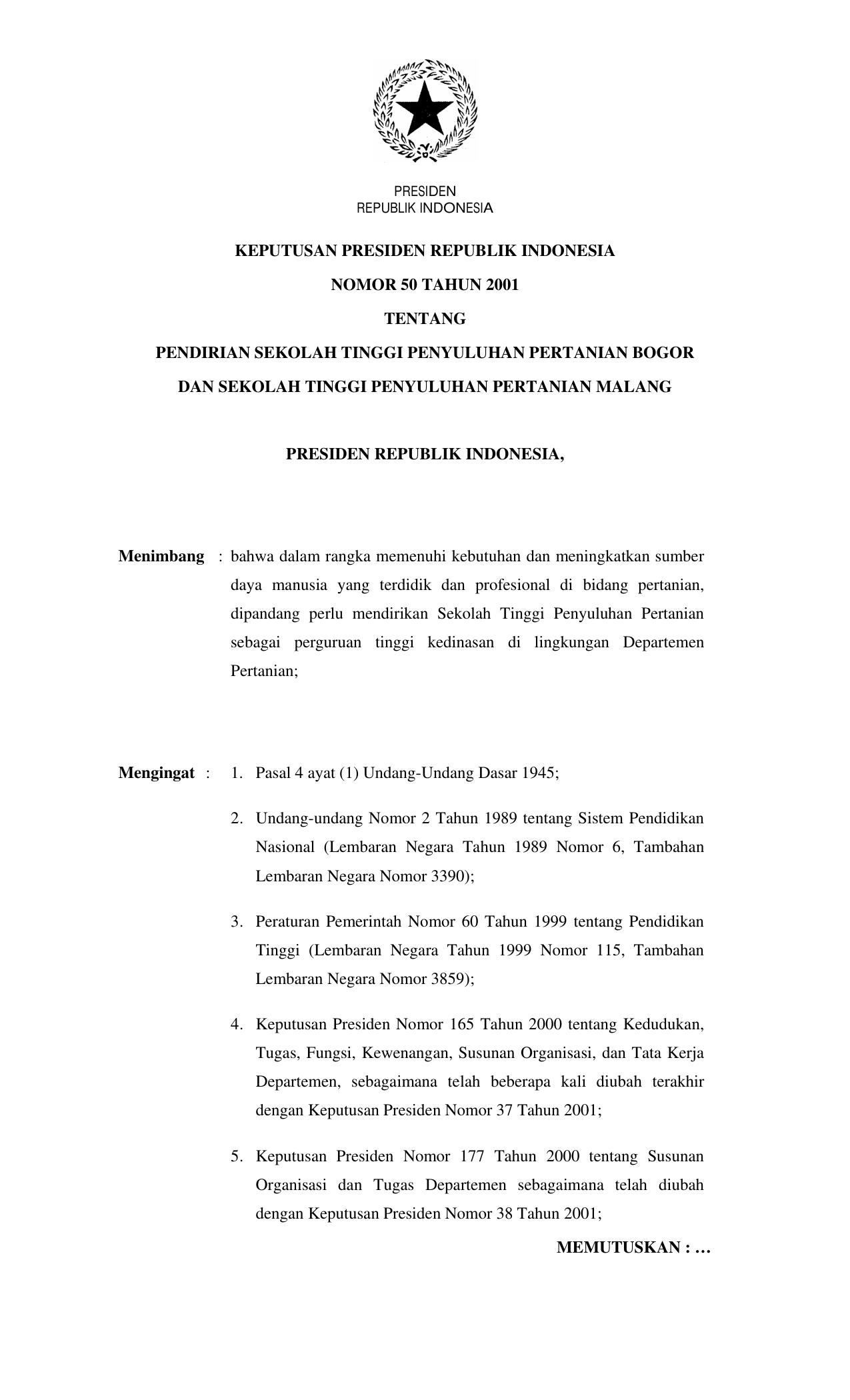 KEPPRES Nomor 50 Tahun 2001 | Keputusan Presiden Nomor 50 Tahun 2001 tentang PENDIRIAN SEKOLAH TINGGI PENYULUHAN PERTANIAN BOGOR DAN SEKOLAH TINGGI PENYULUHAN PERTANIAN MALANG