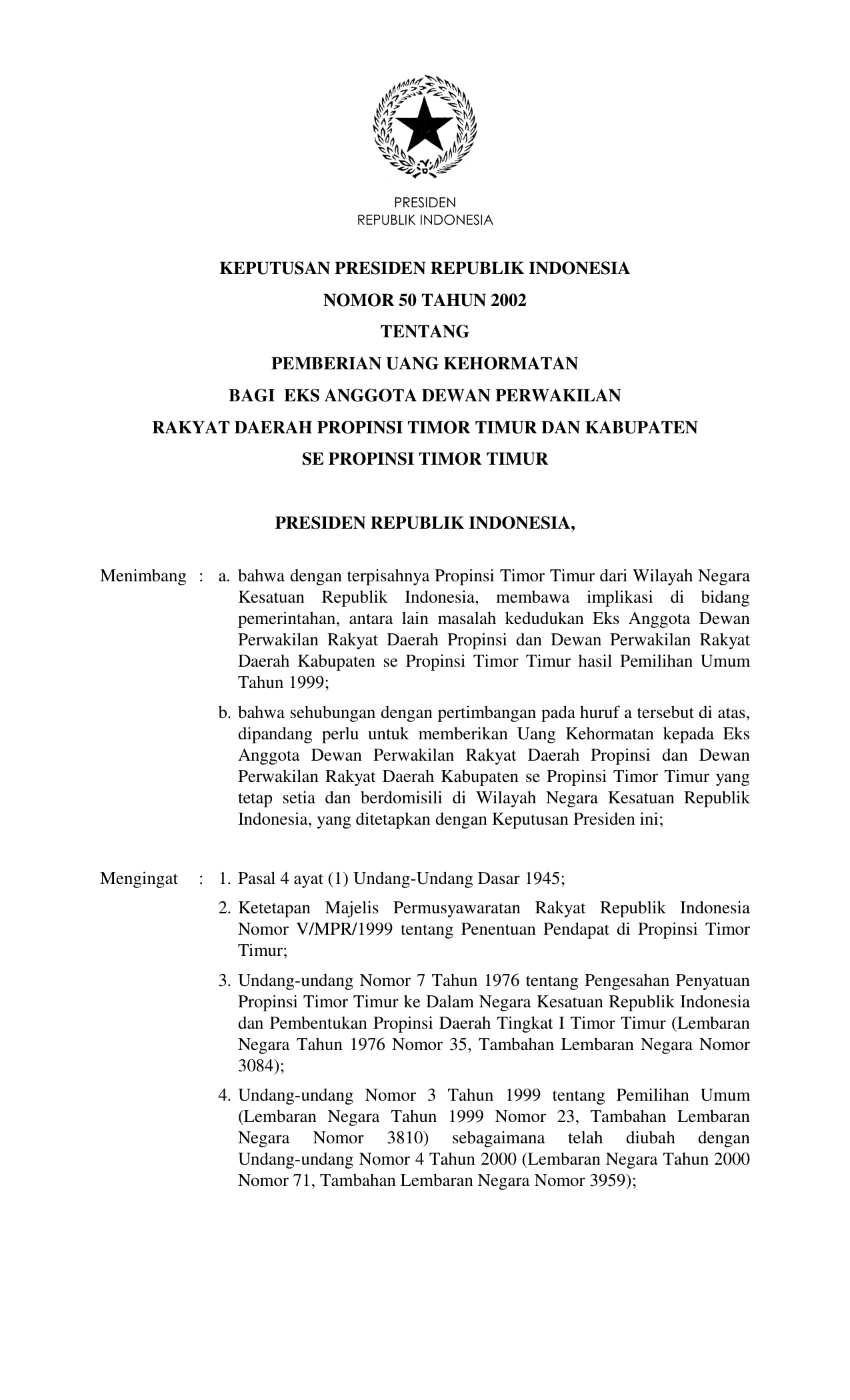 KEPPRES Nomor 50 Tahun 2002 | Keputusan Presiden Nomor 50 Tahun 2002 tentang PEMBERIAN UANG KEHORMATAN BAGI EKS ANGGOTA DEWAN PERWAKILAN RAKYAT DAERAH PROPINSI TIMOR TIMUR DAN KABUPATEN SE-PROPINSI TIMOR TIMUR