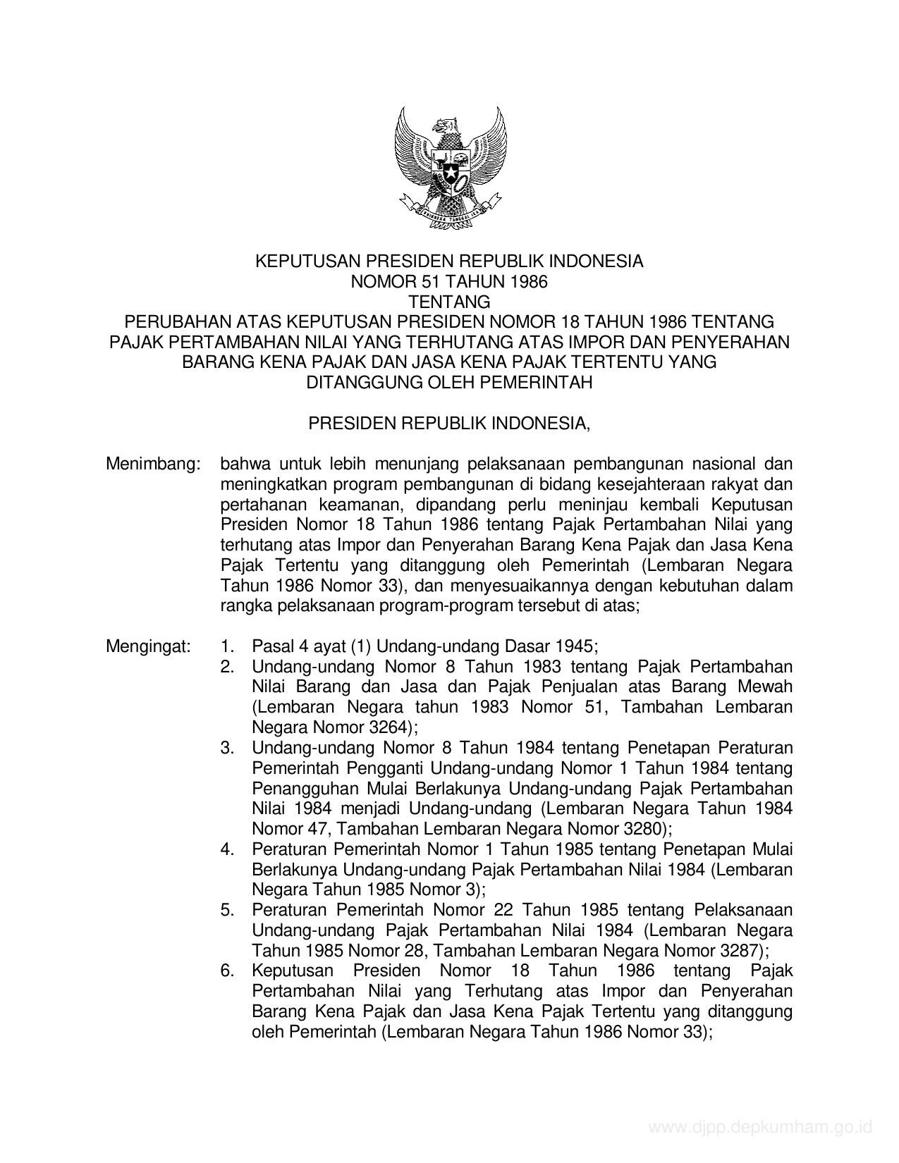 KEPPRES Nomor 51 Tahun 1986 | Keputusan Presiden Nomor 51 Tahun 1986 tentang PERUBAHAN KEPPRES 18-1986 TENTANG PAJAK PERTAMBAHAN NILAI YANG TERHUTANG ATAS IMPOR DAN PENYERAHAN BARANG KENA PAJAK DAN JASA KENA PAJAK TERTENTU YANG DITANGGUNG OLEH PEMERINTAH