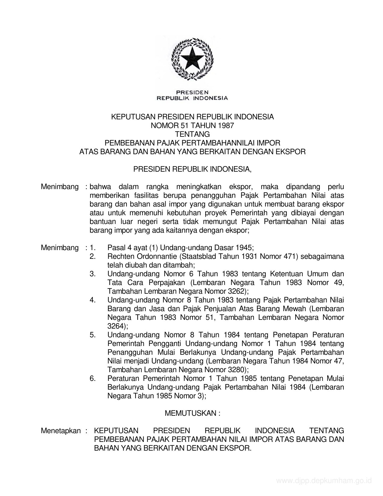 KEPPRES Nomor 51 Tahun 1987 | Keputusan Presiden Nomor 51 Tahun 1987 tentang PEMBEBANAN PAJAK PERTAMBAHAN NILAI IMPORT ATAS BARANG DAN BAHAN YANG BERKAITAN DENGAN EKSPOR
