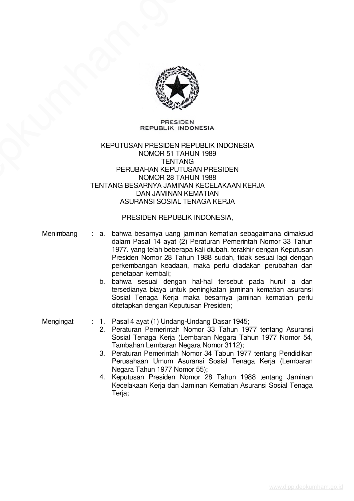 KEPPRES Nomor 51 Tahun 1989 | Keputusan Presiden Nomor 51 Tahun 1989 tentang PERUBAHAN KEPUTUSAN PRESIDEN NOMOR 28 TAHUN 1988 TENTANG JAMINAN KEMATIAN ASURANSI SOSIAL TENAGA KERJA