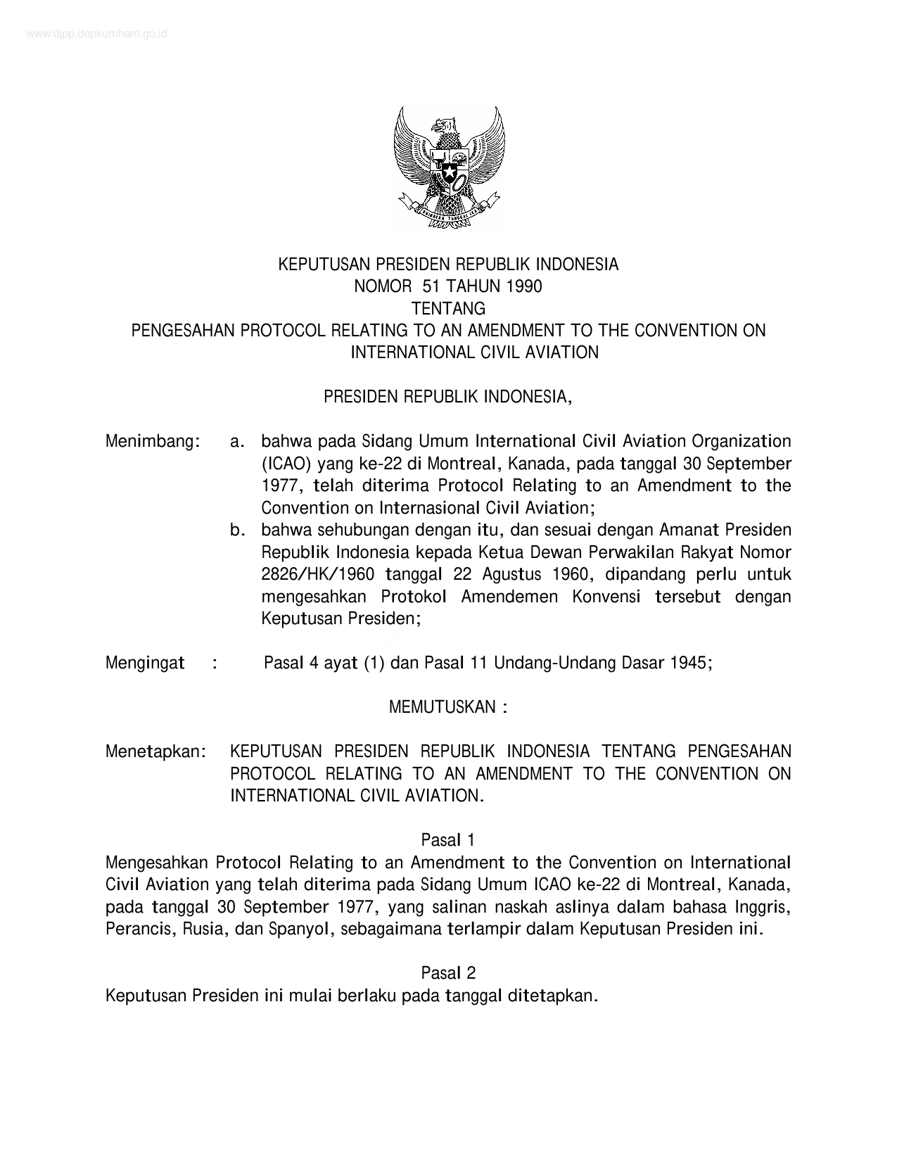 KEPPRES Nomor 51 Tahun 1990 | Keputusan Presiden Nomor 51 Tahun 1990 tentang PENGESAHAN PROTOCOL RELATING TO AN AMENDMENT TO THE CONVENTION ON INTERNATIONAL CIVIL AVIATION
