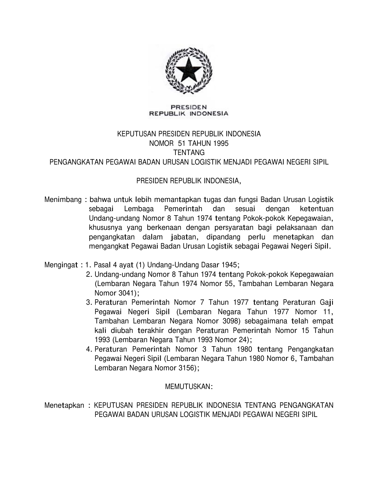 KEPPRES Nomor 51 Tahun 1995 | Keputusan Presiden Nomor 51 Tahun 1995 tentang PENGANGKATAN PEGAWAI BADAN URUSAN LOGISTIK MENJADI PEGAWAI NEGERI SIPIL