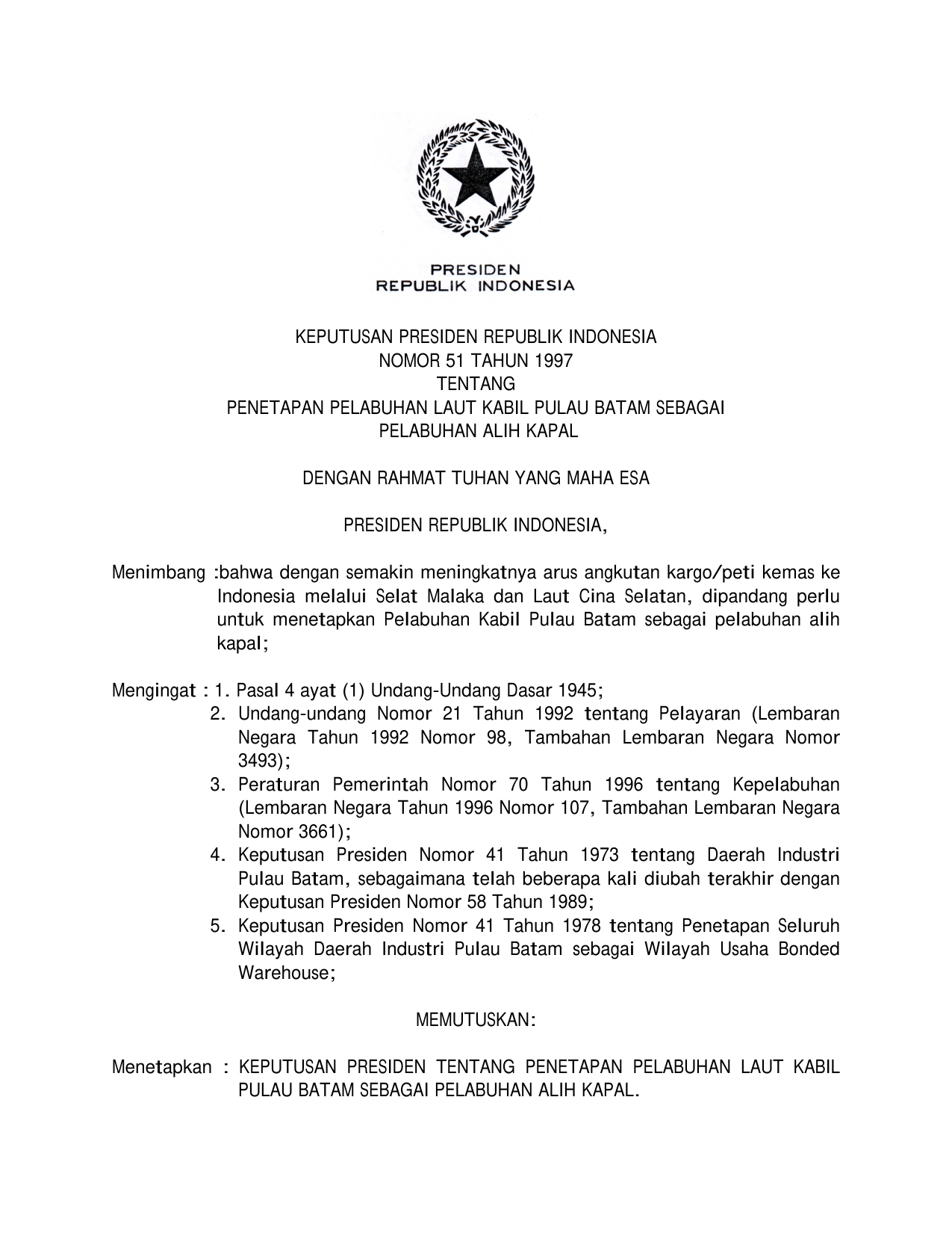 KEPPRES Nomor 51 Tahun 1997 | Keputusan Presiden Nomor 51 Tahun 1997 tentang PENETAPAN PELABUHAN LAUT KABIT PULAU BATAM SEBAGAI PELABUHAN ALIH KAPAL