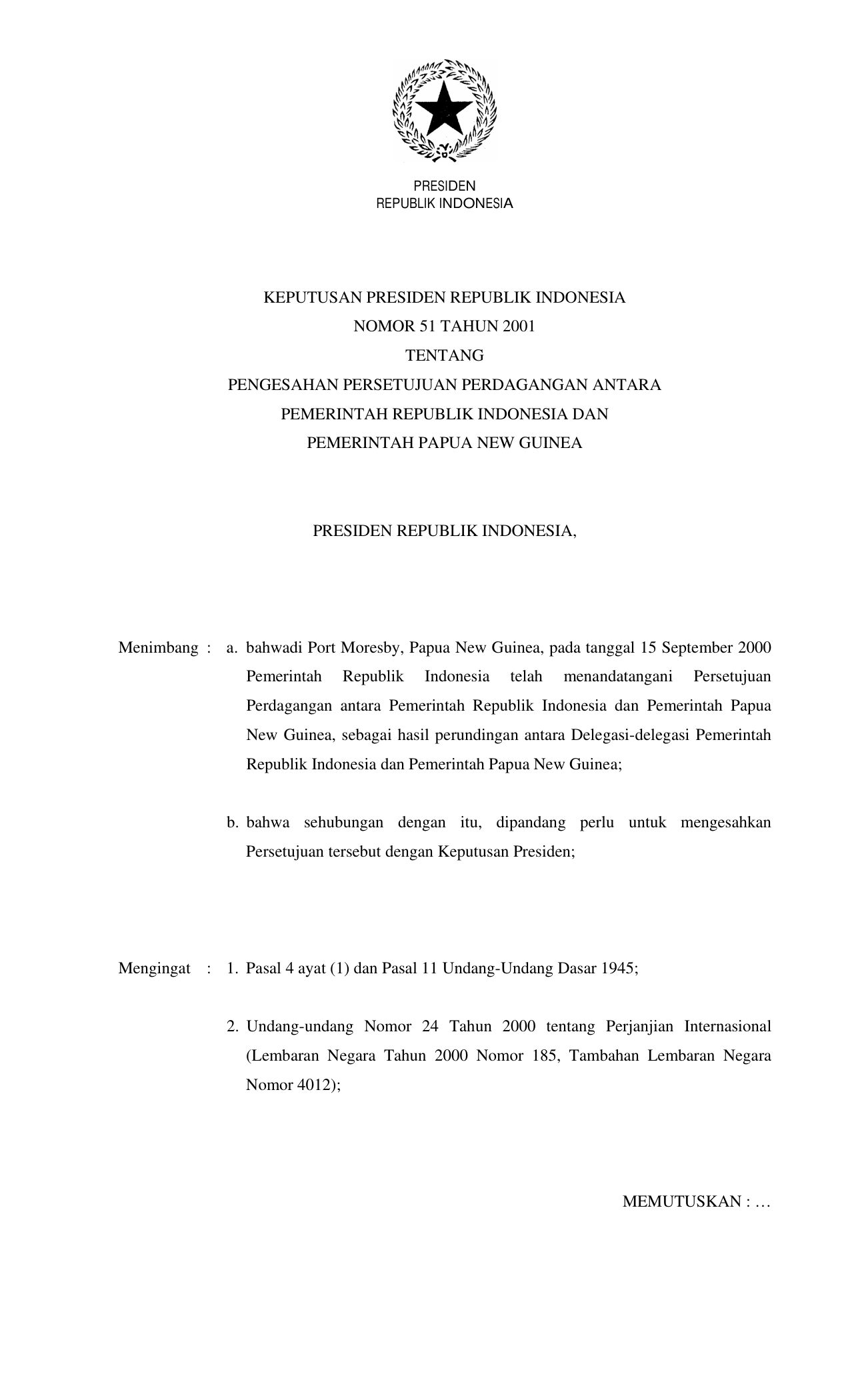 KEPPRES Nomor 51 Tahun 2001 | Keputusan Presiden Nomor 51 Tahun 2001 tentang PENGESAHAN PERSETUJUAN PERDAGANGAN ANTARA PEMERINTAH RI DAN PEMERINTAH PAPUA NEW GUINEA