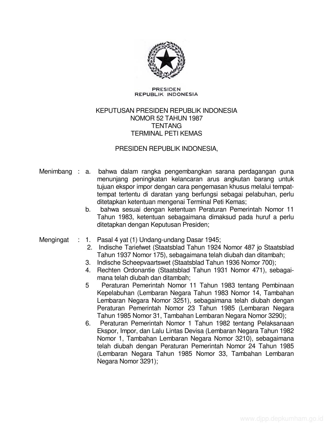 KEPPRES Nomor 52 Tahun 1987 | Keputusan Presiden Nomor 52 Tahun 1987 tentang TERMINAL PETI KEMAS