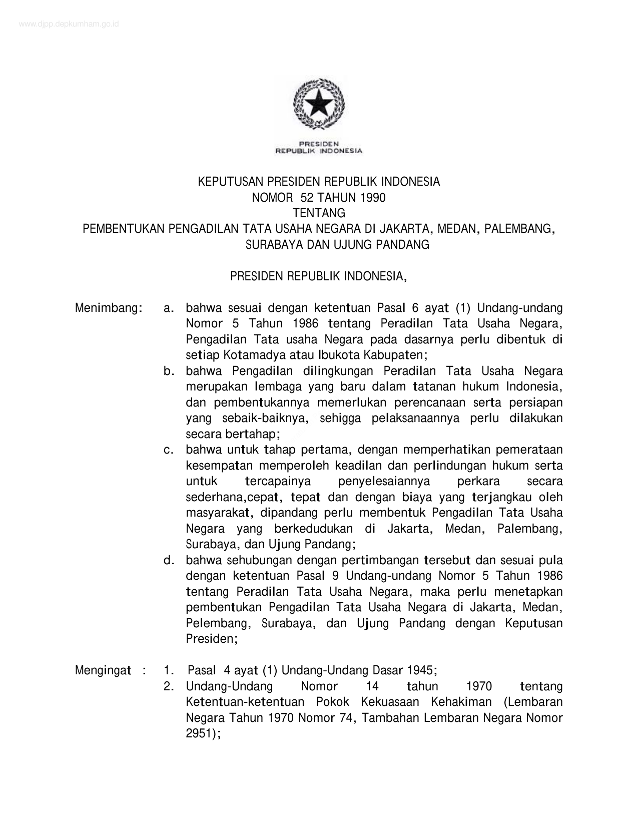 KEPPRES Nomor 52 Tahun 1990 | Keputusan Presiden Nomor 52 Tahun 1990 tentang PEMBENTUKAN PENGADILAN TATA USAHA NEGARA DI JAKARTA, MEDAN, PALEMBANG, SURABAYA DAN UJUNG PANDANG