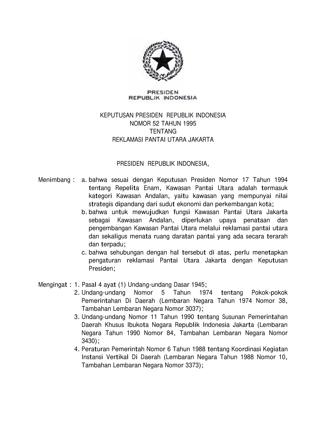 KEPPRES Nomor 52 Tahun 1995 | Keputusan Presiden Nomor 52 Tahun 1995 tentang REKLAMASI PANTAI UTARA JAKARTA