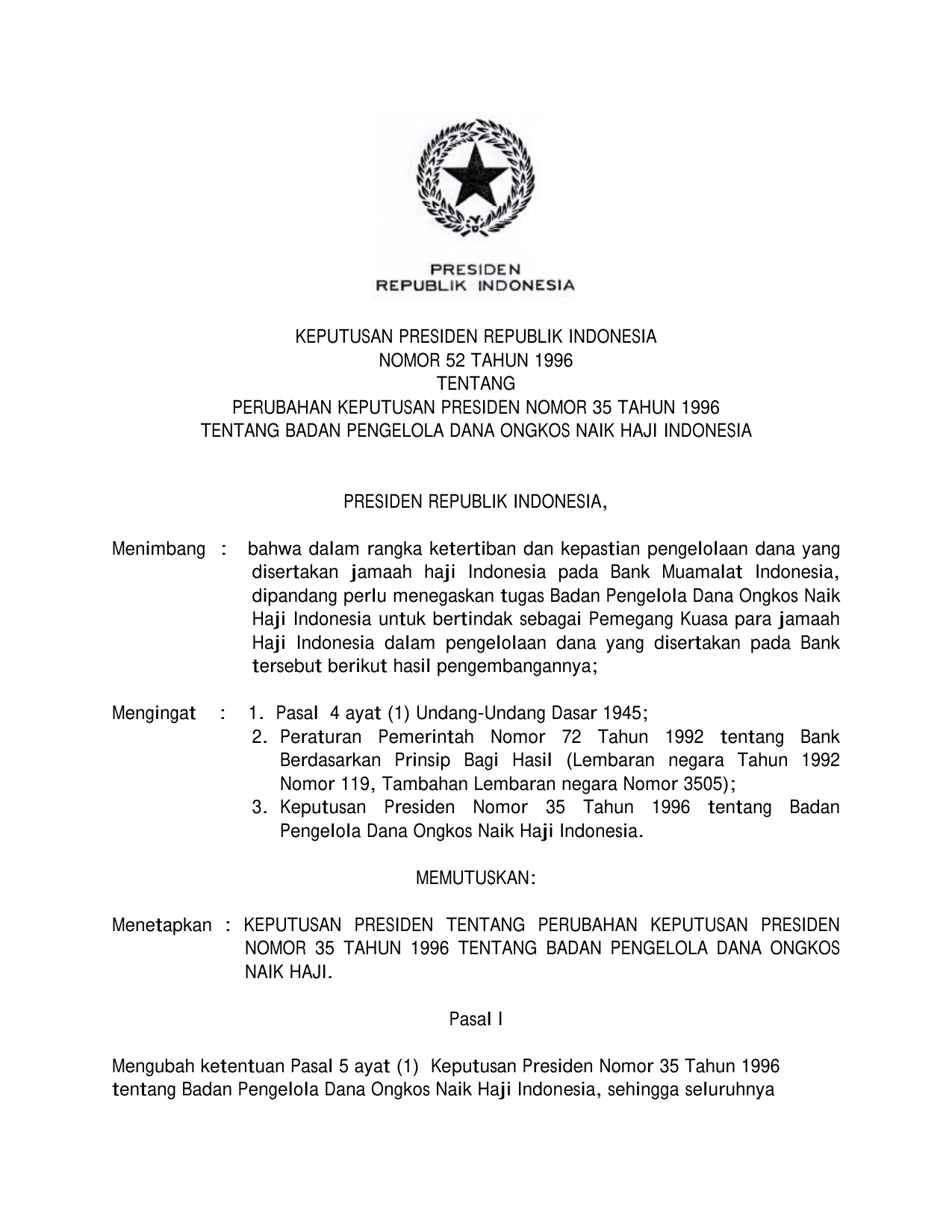 KEPPRES Nomor 52 Tahun 1996 | Keputusan Presiden Nomor 52 Tahun 1996 tentang PERUBAHAN KEPPRES 35-1996 TENTANG BADAN PENGELOLA DANA ONGKOS NAIK HAJI INDONESIA