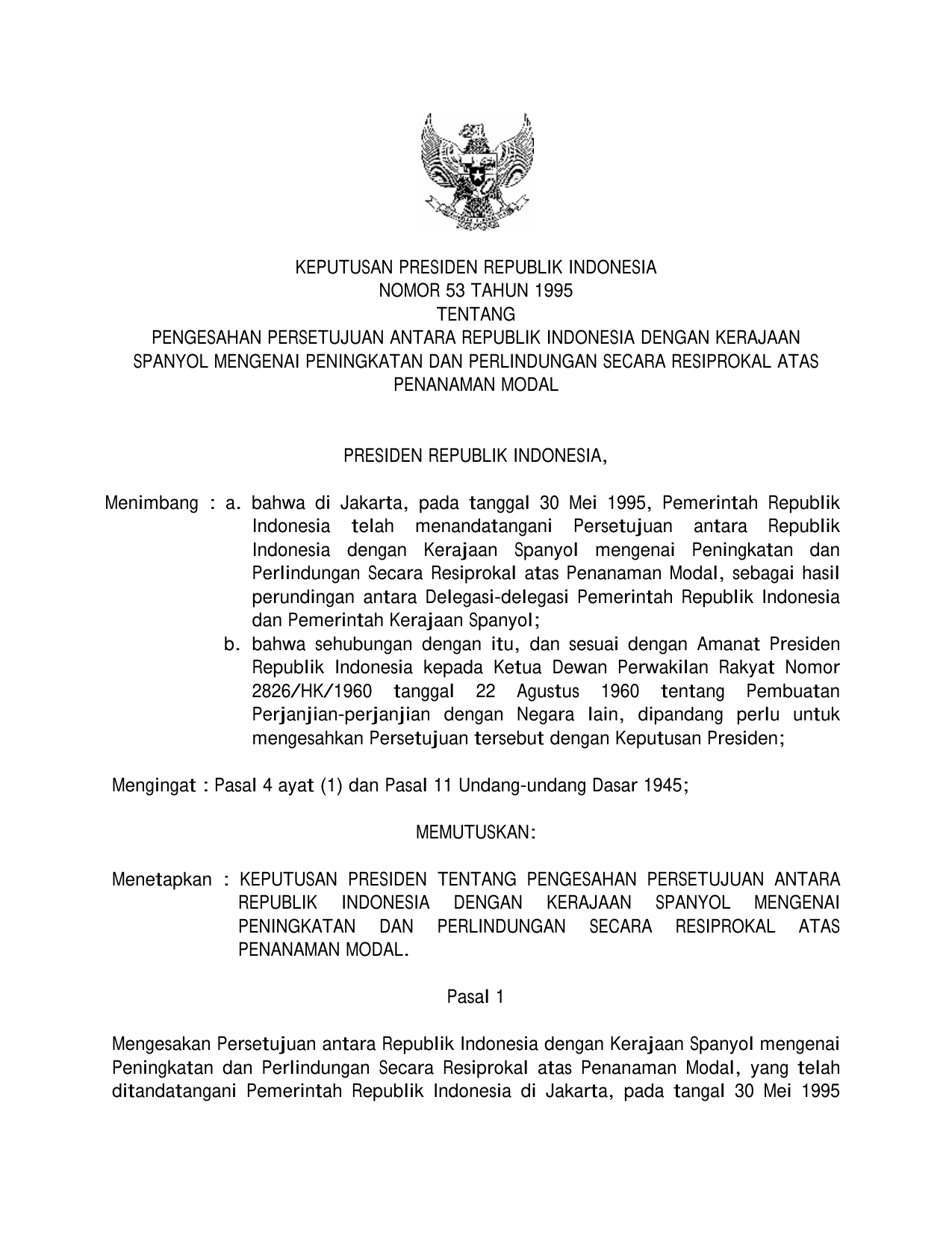 KEPPRES Nomor 53 Tahun 1995 | Keputusan Presiden Nomor 53 Tahun 1995 tentang PENGESAHAN PERSETUJUAN ANTARA RI DENGAN KERAJAAN SPANYOL MENGENAI PENINGKATAN DAN PERLINDUNGAN SECARA RESIPROKAL ATAS PENANAMAN MODAL
