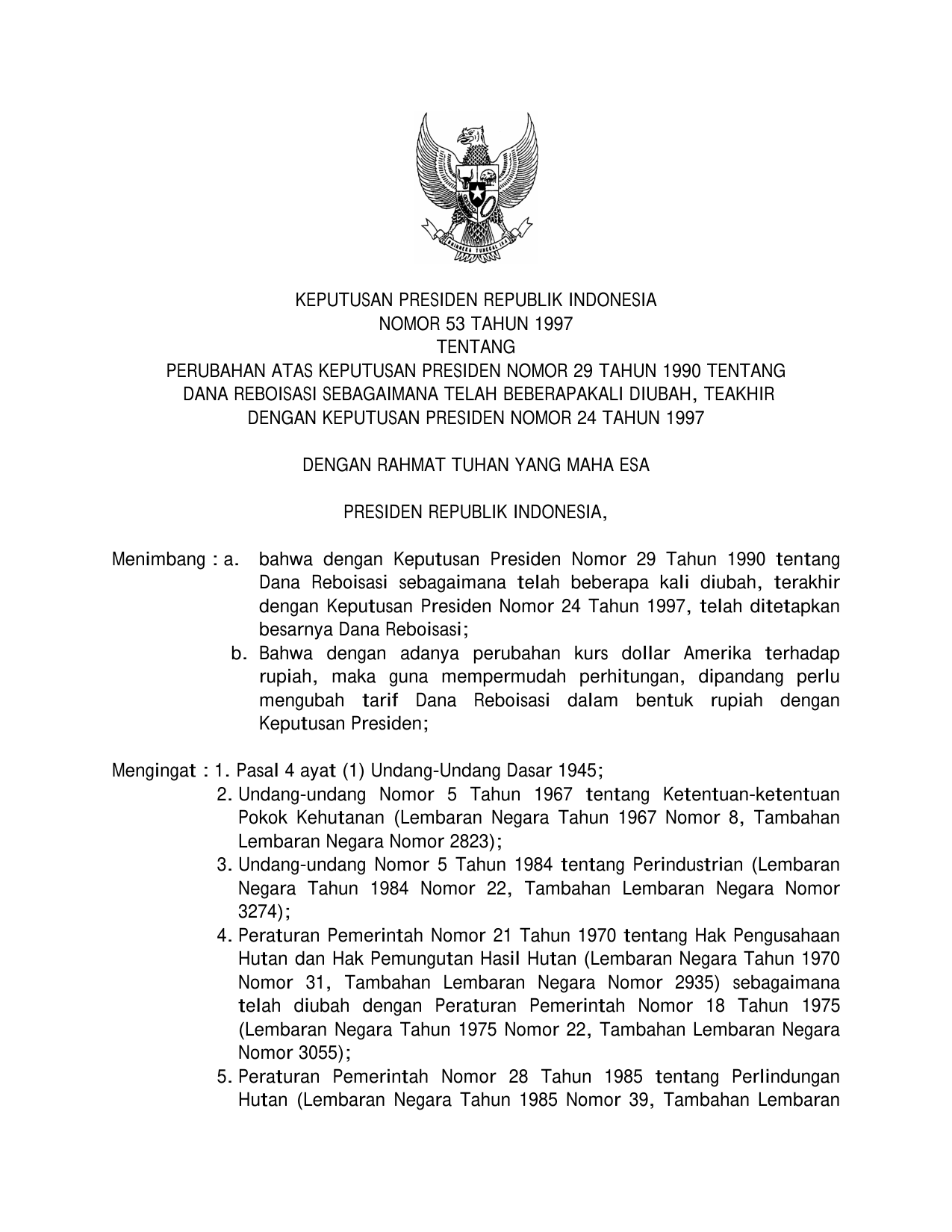 KEPPRES Nomor 53 Tahun 1997 | Keputusan Presiden Nomor 53 Tahun 1997 tentang PERUBAHAN KEPPRES 29-1990 TENTANG DANA REBOISASI SEBAGAIMAN TELAH BEBERAPA KALI DIUBAH, TERAKHIR DENGAN KEPPRES 24-1997