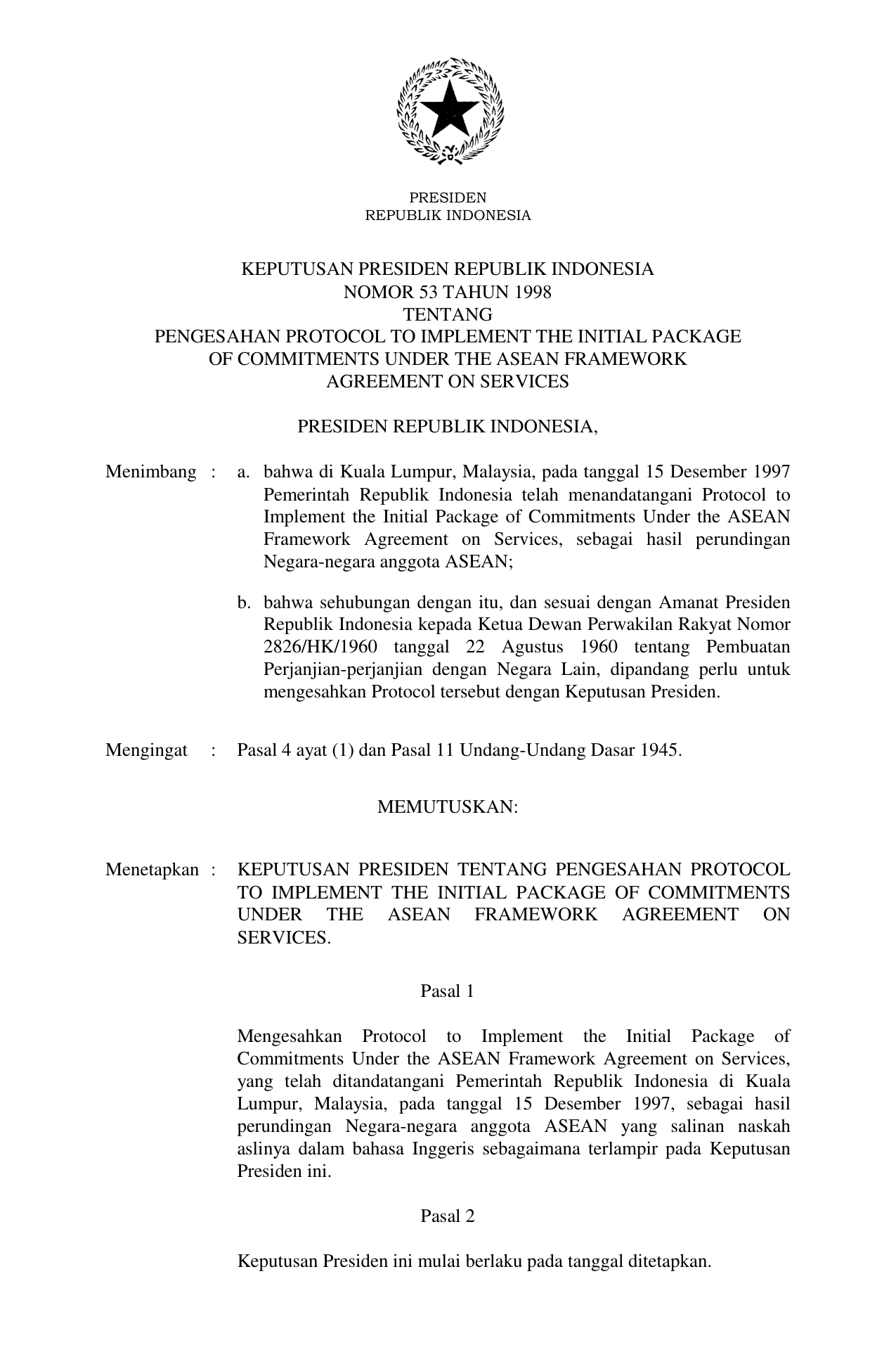 KEPPRES Nomor 53 Tahun 1998 | Keputusan Presiden Nomor 53 Tahun 1998 tentang PENGESAHAN PROTOCOL TO IMPLEMENT THE INITIAL PACKAGE OF COMMITMENTS UNDER THE ASEAN FRAMEWORK AGREEMENT ON SERVICES