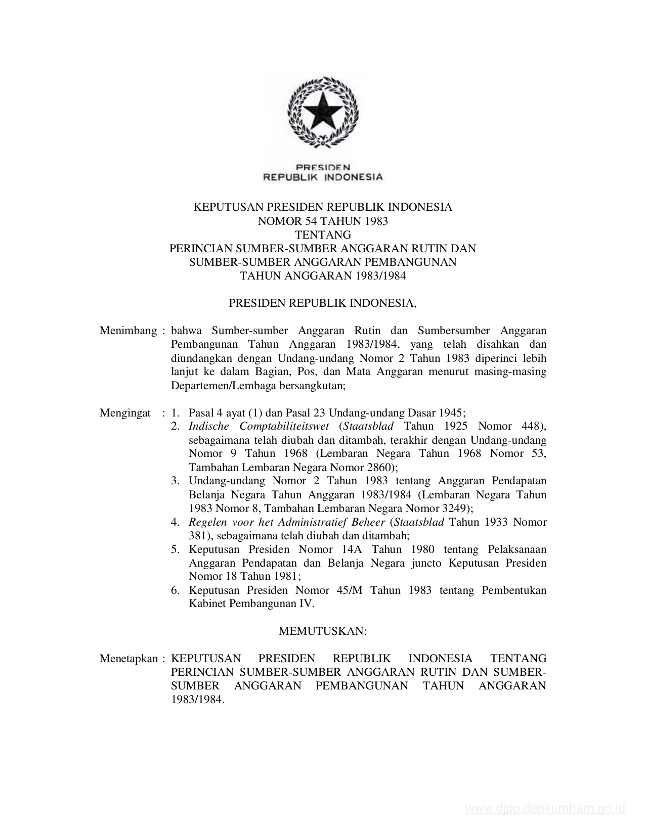 KEPPRES Nomor 54 Tahun 1983 | Keputusan Presiden Nomor 54 Tahun 1983 tentang PRINCIAN SUMBER-SUMBER ANGGARAN RUTIN DAN SUMBER-SUMBER ANGGARAN PEMBANGUNAN TAHUN ANGGARAN 1983/1984