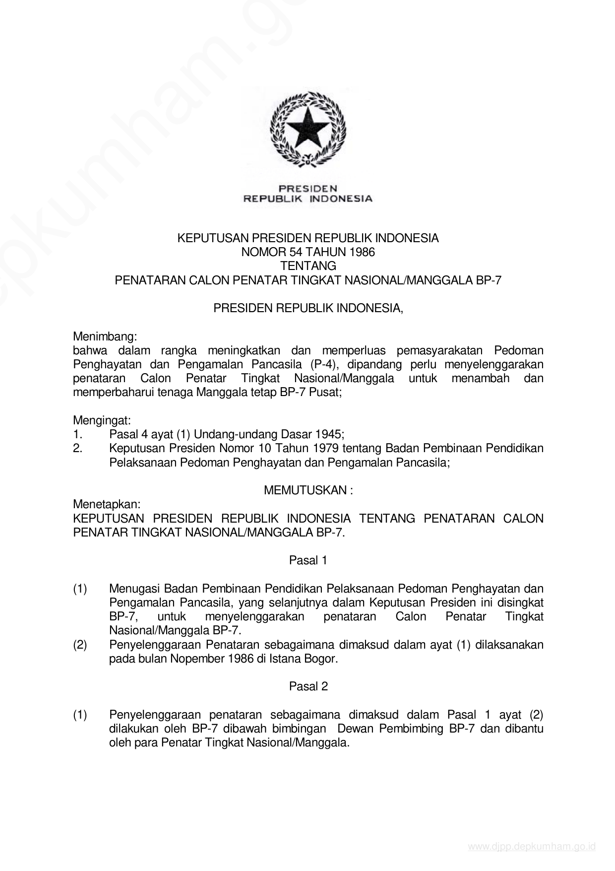 KEPPRES Nomor 54 Tahun 1986 | Keputusan Presiden Nomor 54 Tahun 1986 tentang PENATARAN CALON PENATAR TINGKAT NASIONAL/ MANGGALA BP-7