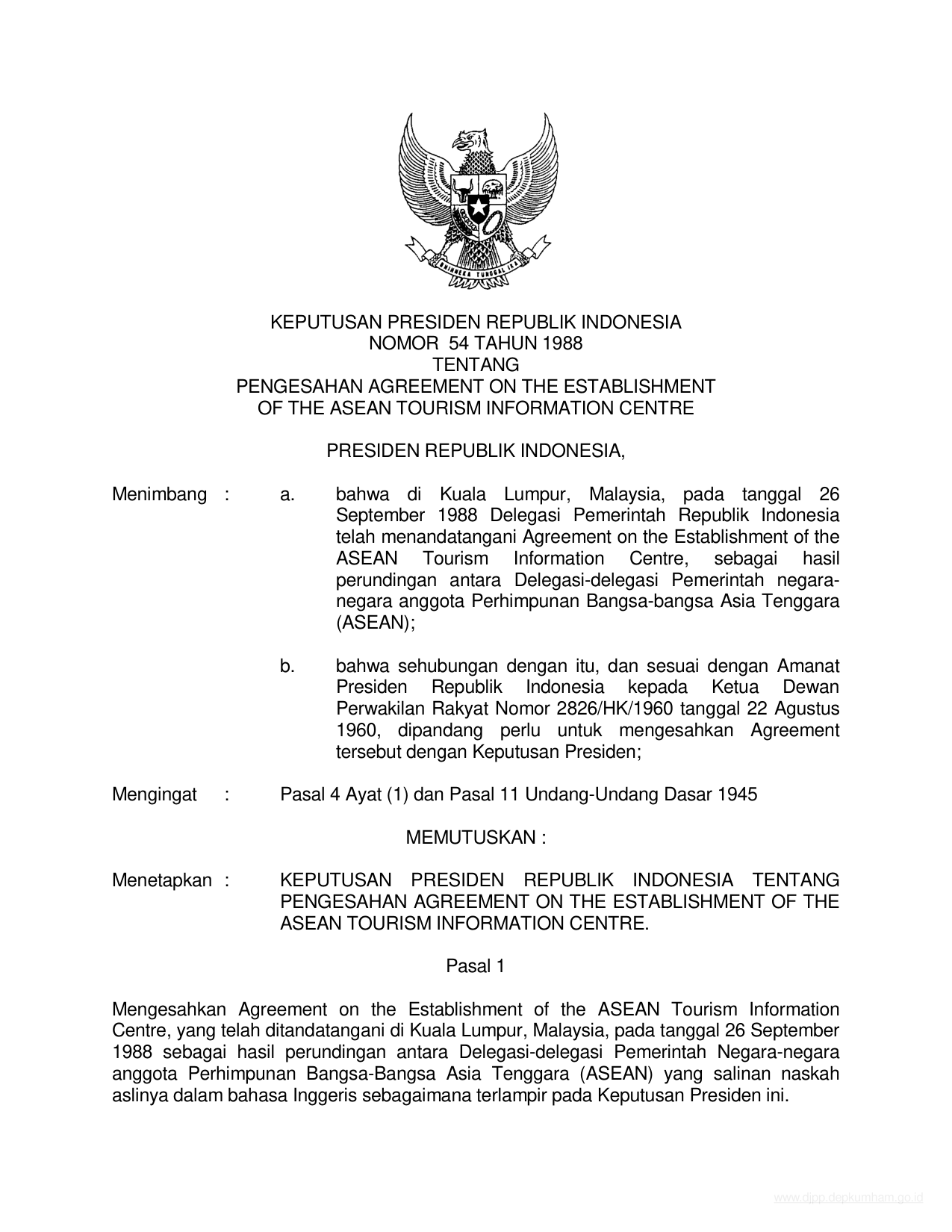 KEPPRES Nomor 54 Tahun 1988 | Keputusan Presiden Nomor 54 Tahun 1988 tentang PENGESAHAN AGREEMENT ON THE ESTABLISHMENT OF THE ASEAN TOURISM INFORMATION CENTER