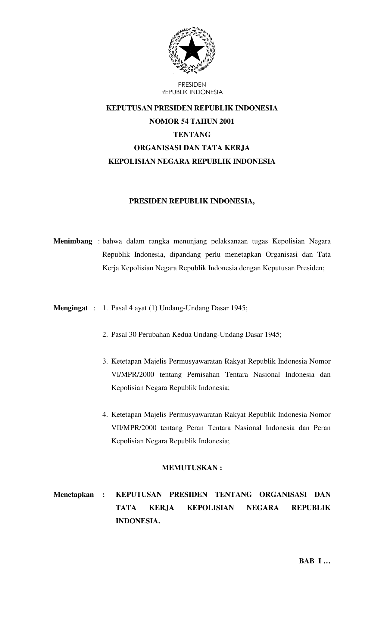 KEPPRES Nomor 54 Tahun 2001 | Keputusan Presiden Nomor 54 Tahun 2001 tentang ORGANISASI DAN TATA KERJA KEPOLISIAN NEGARA RI