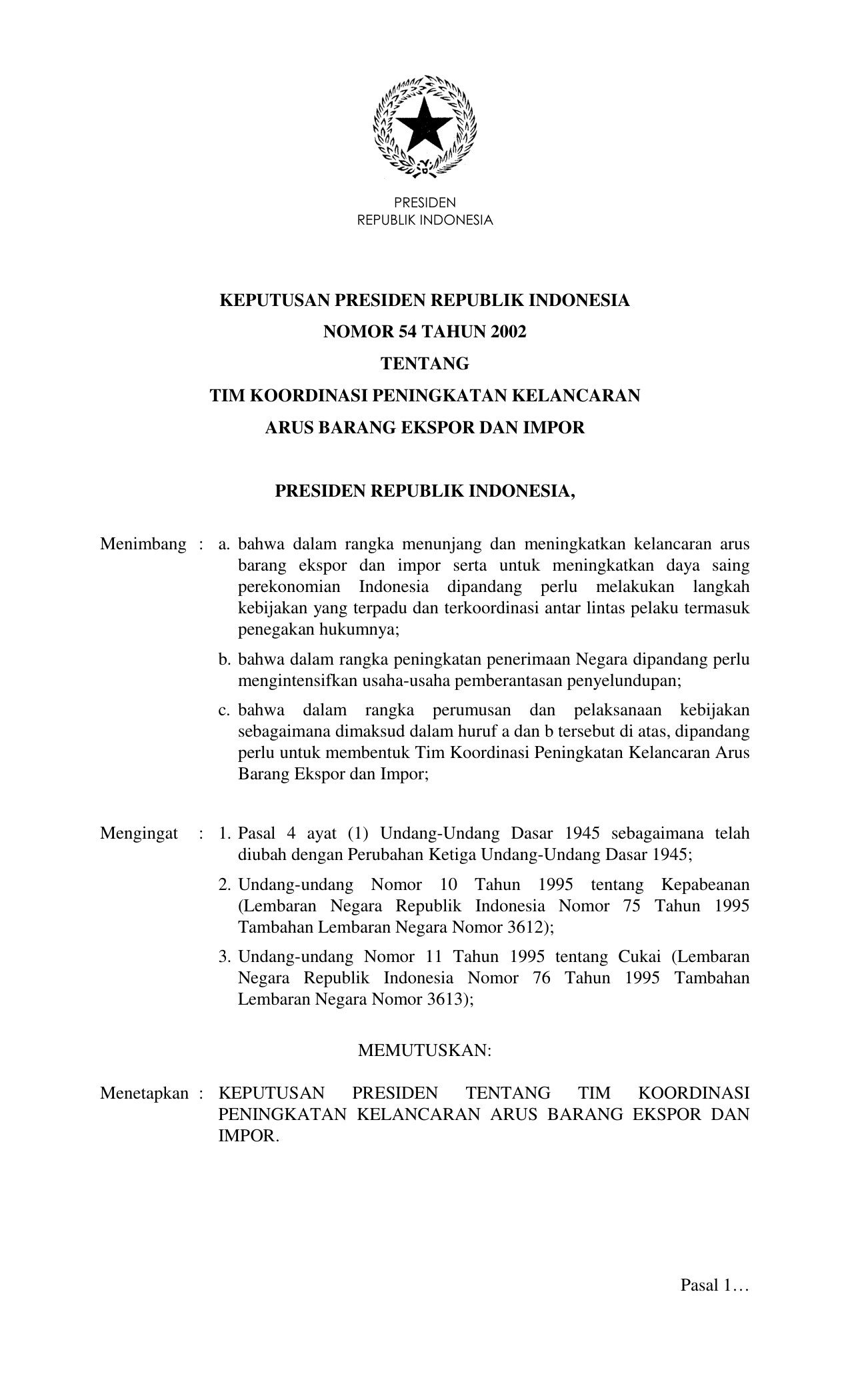 KEPPRES Nomor 54 Tahun 2002 | Keputusan Presiden Nomor 54 Tahun 2002 tentang TIM KOORDINASI PENINGKATAN KELANCARAN ARUS BARANG EKSPOR DAN IMPOR