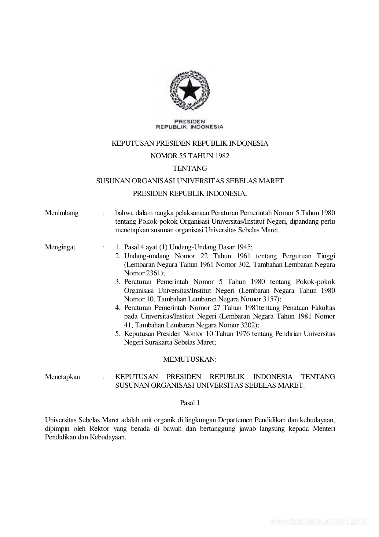 KEPPRES Nomor 55 Tahun 1982 | Keputusan Presiden Nomor 55 Tahun 1982 tentang SUSUNAN ORGANISASI UNIVERSITAS SEBELAS MARET