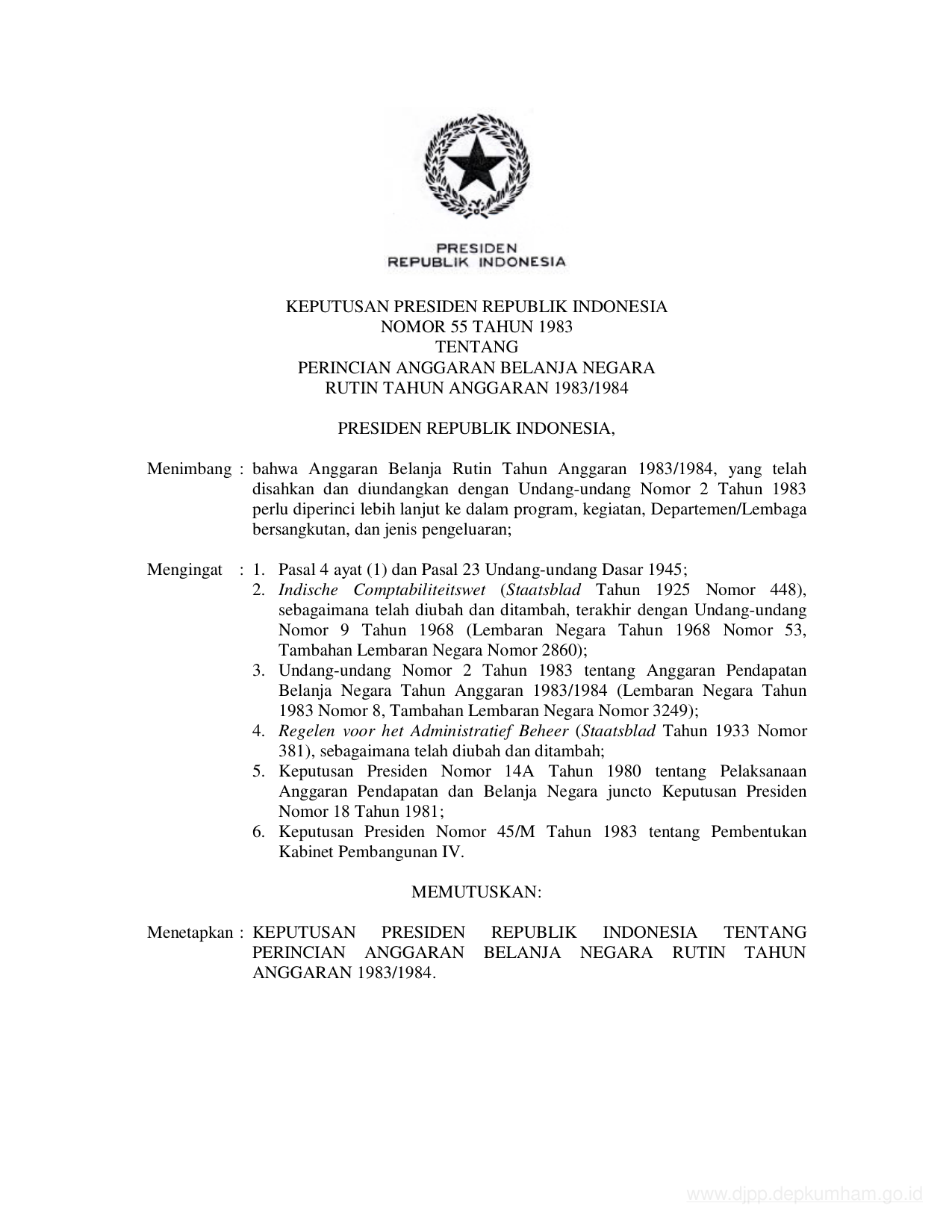 KEPPRES Nomor 55 Tahun 1983 | Keputusan Presiden Nomor 55 Tahun 1983 tentang PERINCIAN ANGGARAN BELANJA NEGARA RUTIN TAHUN ANGGARAN 1983/1984