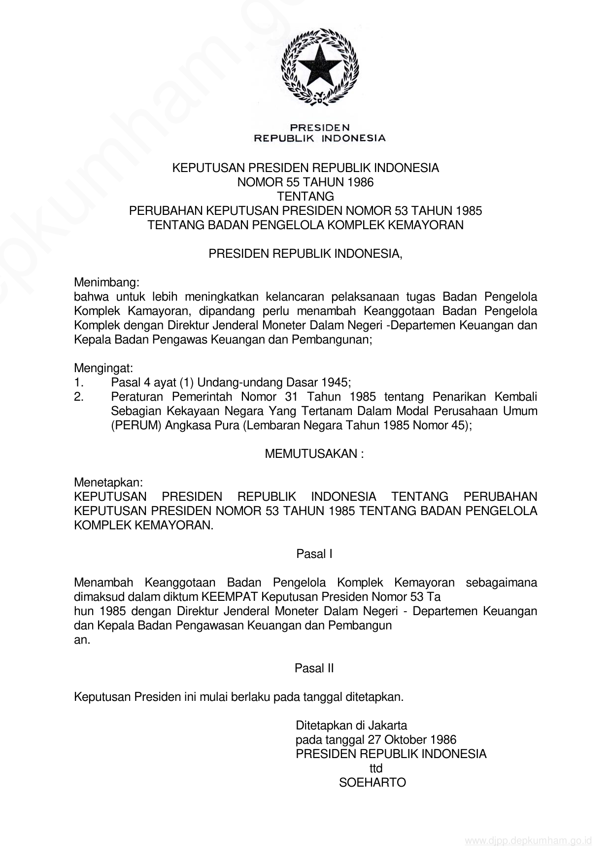 KEPPRES Nomor 55 Tahun 1986 | Keputusan Presiden Nomor 55 Tahun 1986 tentang PERUBAHAN KEPUTUSAN PRESIDEN NOMOR 53 TAHUN 1985 TENTANG BADAN PENGELOLA KOMPLEK KEMAYORAN