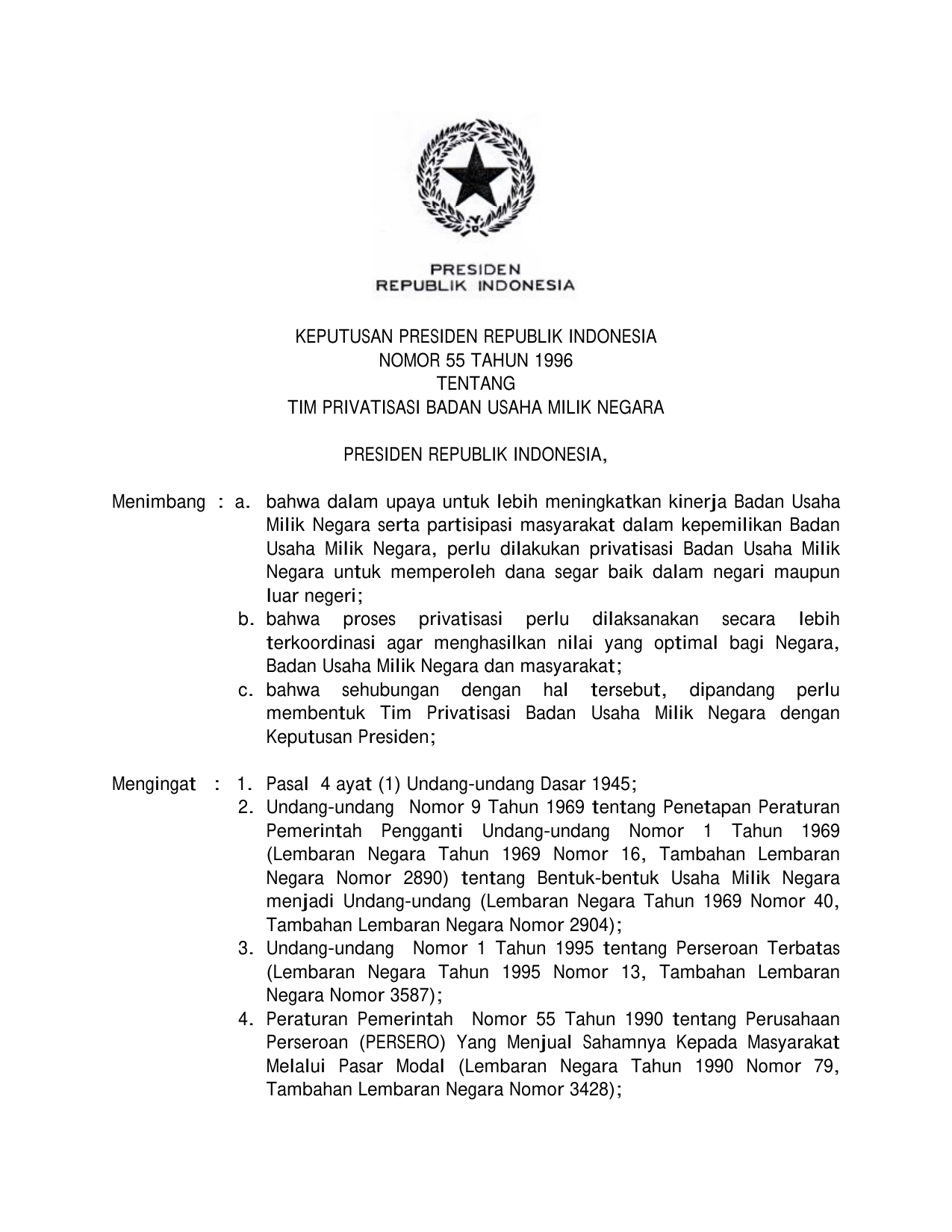 KEPPRES Nomor 55 Tahun 1996 | Keputusan Presiden Nomor 55 Tahun 1996 tentang TIM PRIVATISASI BADAN USAHA MILIK NEGARA