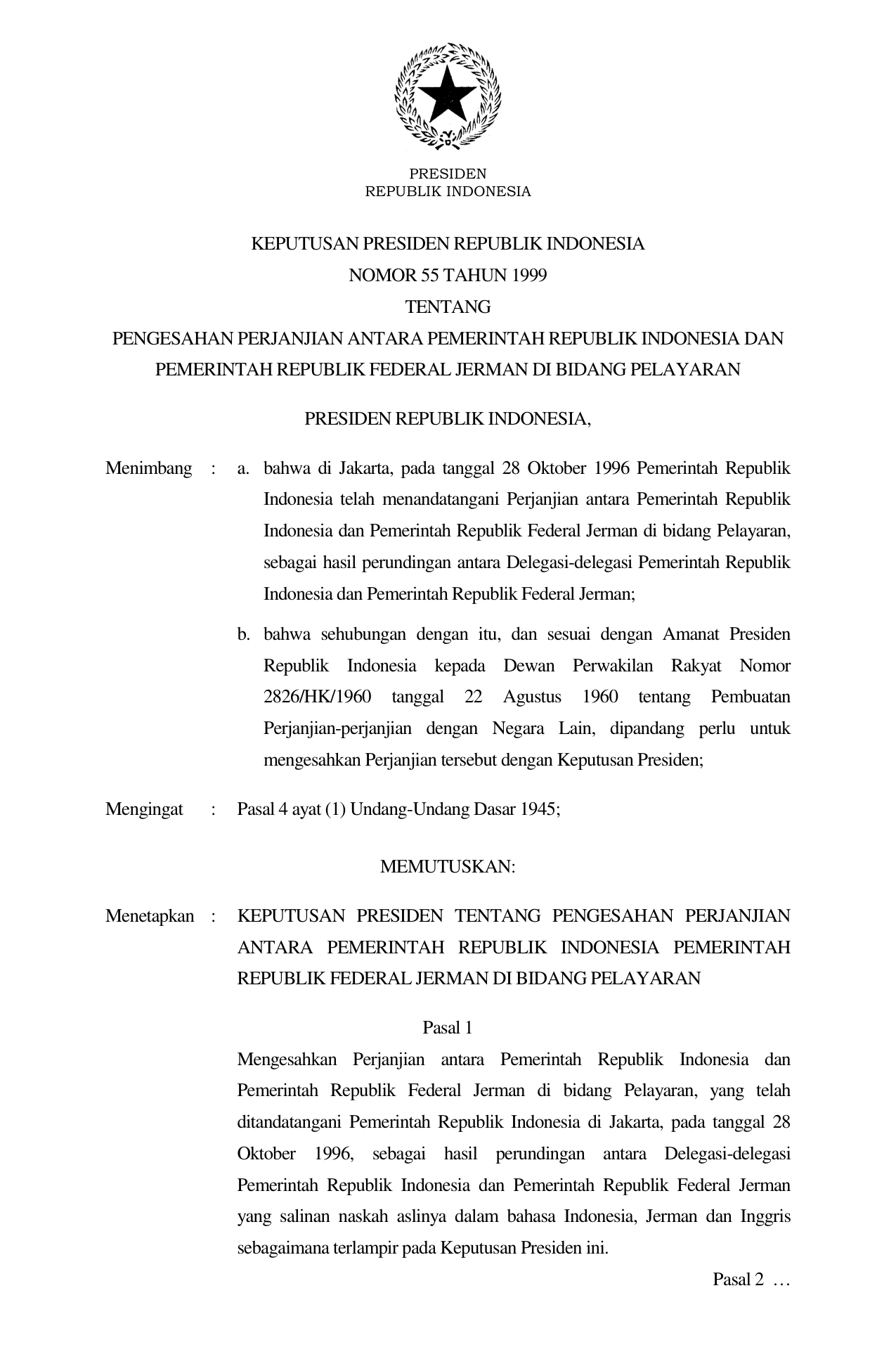 KEPPRES Nomor 55 Tahun 1999 | Keputusan Presiden Nomor 55 Tahun 1999 tentang PENGESAHAN PERJANJIAN ANTARA PEMERINTAH RI DAN PEMERINTAH REPUBLIK FEDERAL JERMAN DI BIDANG PELAYARAN