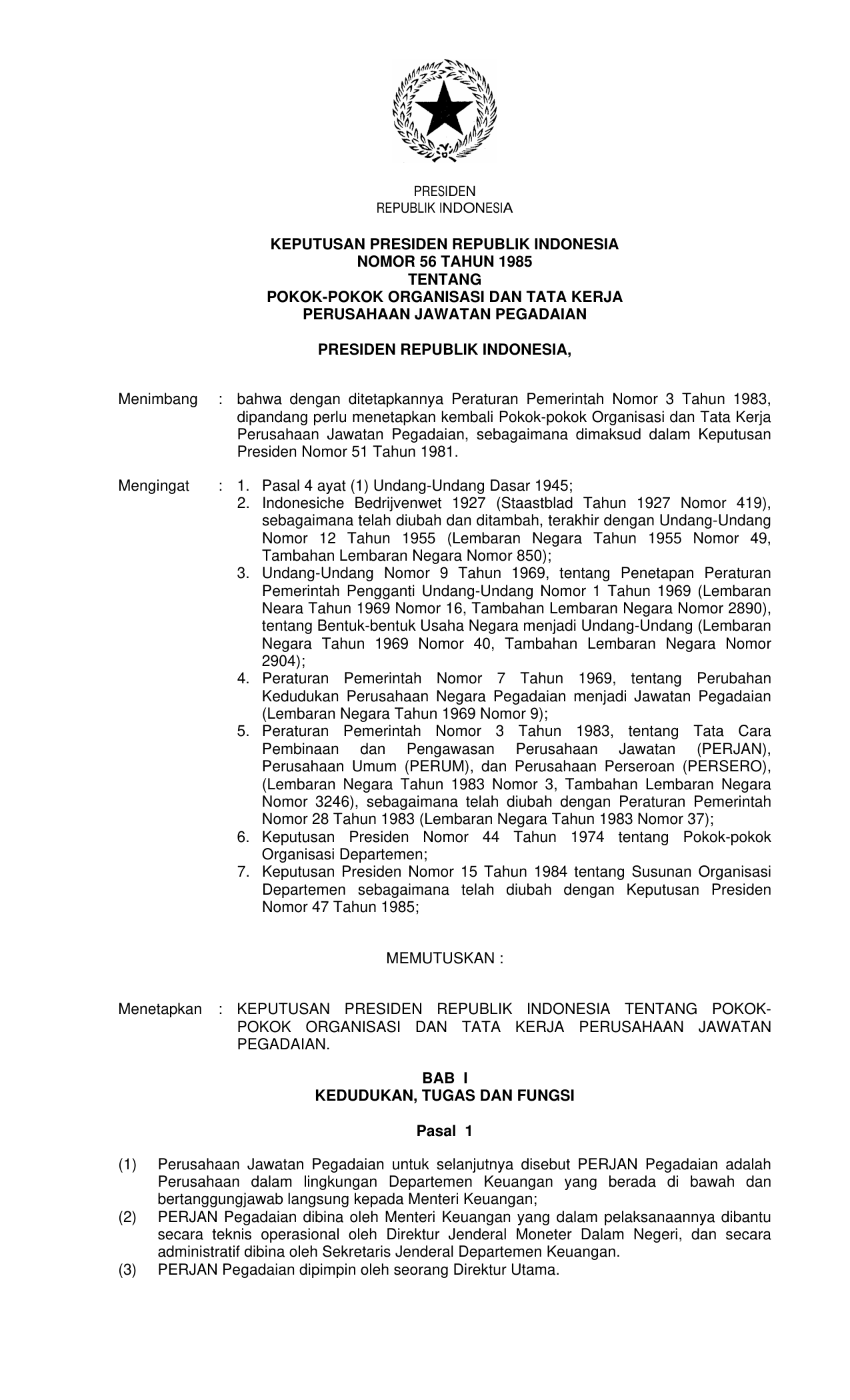 KEPPRES Nomor 56 Tahun 1985 | Keputusan Presiden Nomor 56 Tahun 1985 tentang POKOK-POKOK ORGANISASI DAN TATA KERJA PERUSAHAAAN JAWATAN PEGADAIAN