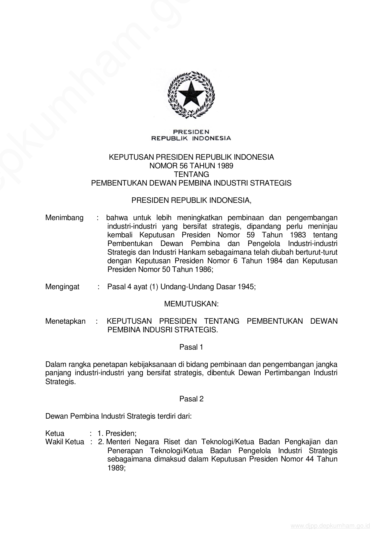KEPPRES Nomor 56 Tahun 1989 | Keputusan Presiden Nomor 56 Tahun 1989 tentang PEMBENTUKAN DEWAN PEMBINA INDUSTRI STRATEGIS