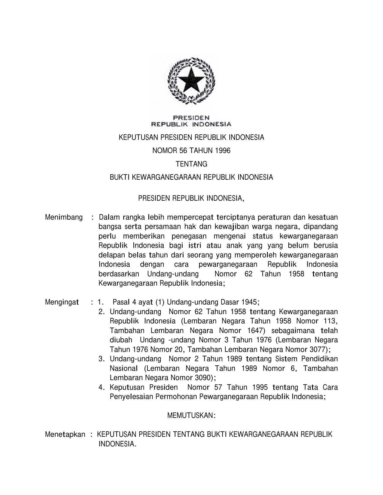 KEPPRES Nomor 56 Tahun 1996 | Keputusan Presiden Nomor 56 Tahun 1996 tentang BUKTI KEWARGANEGARAAN RI