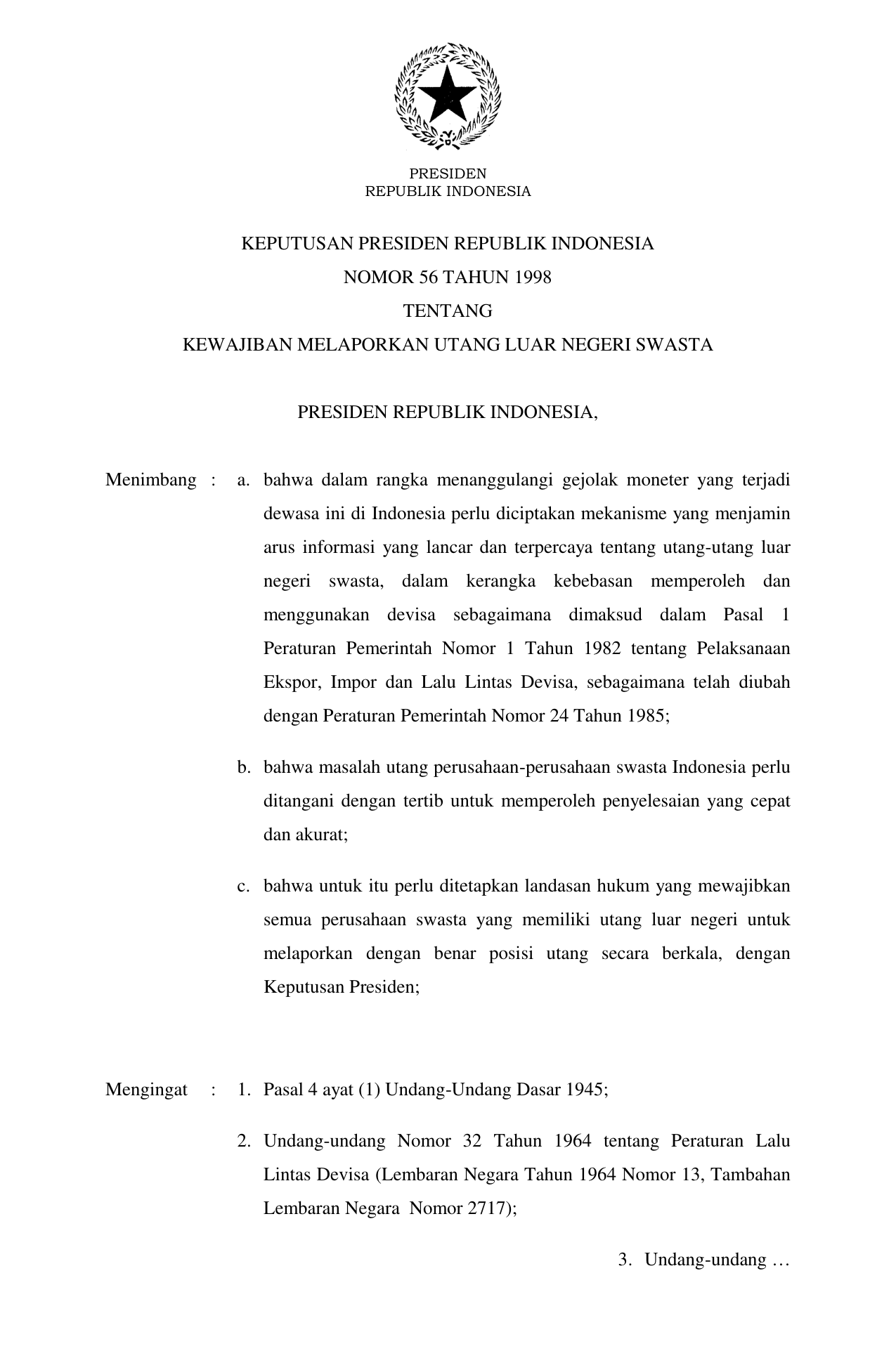 KEPPRES Nomor 56 Tahun 1998 | Keputusan Presiden Nomor 56 Tahun 1998 tentang KEWAJIBAN MELAPORKAN UTANG LUAR NEGERI SWASTA