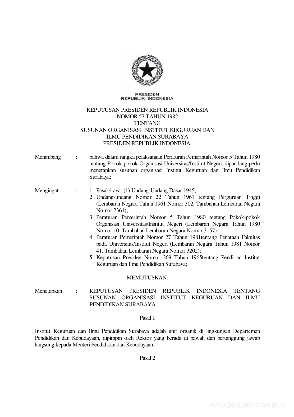 KEPPRES Nomor 57 Tahun 1982 | Keputusan Presiden Nomor 57 Tahun 1982 tentang SUSUNAN ORGANISASI INSTITUT KEGURUAN DAN ILMU PENDIDIKAN SURABAYA