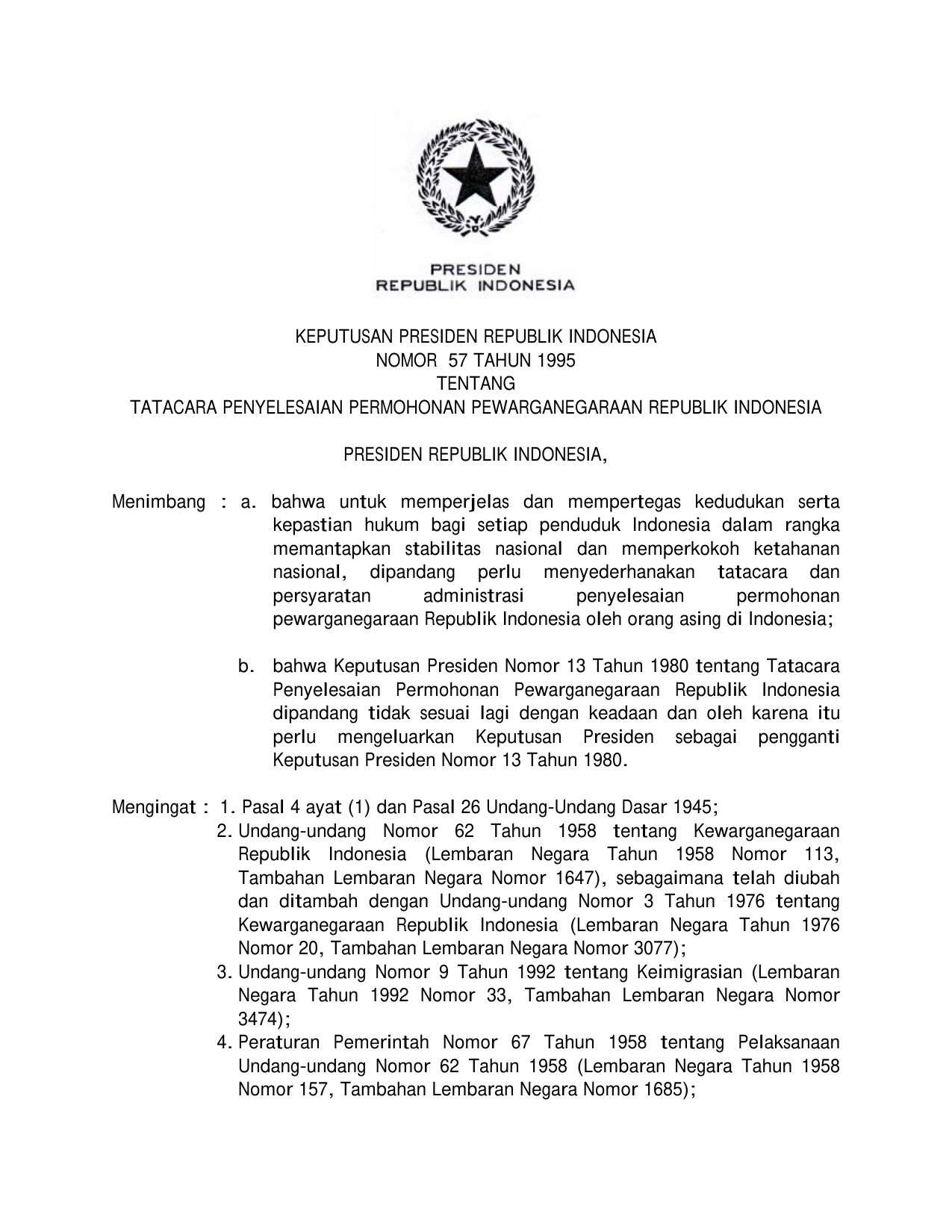 KEPPRES Nomor 57 Tahun 1995 | Keputusan Presiden Nomor 57 Tahun 1995 tentang TATA CARA PENYELESAIAN PERMOHONAN PEWARGANEGARAAN RI