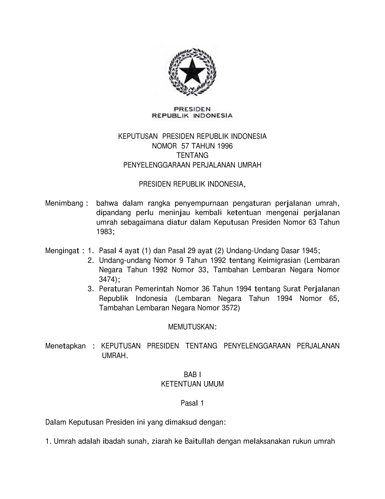 KEPPRES Nomor 57 Tahun 1996 | Keputusan Presiden Nomor 57 Tahun 1996 tentang PENYELENGGARAAN PERJALANAN UMRAH