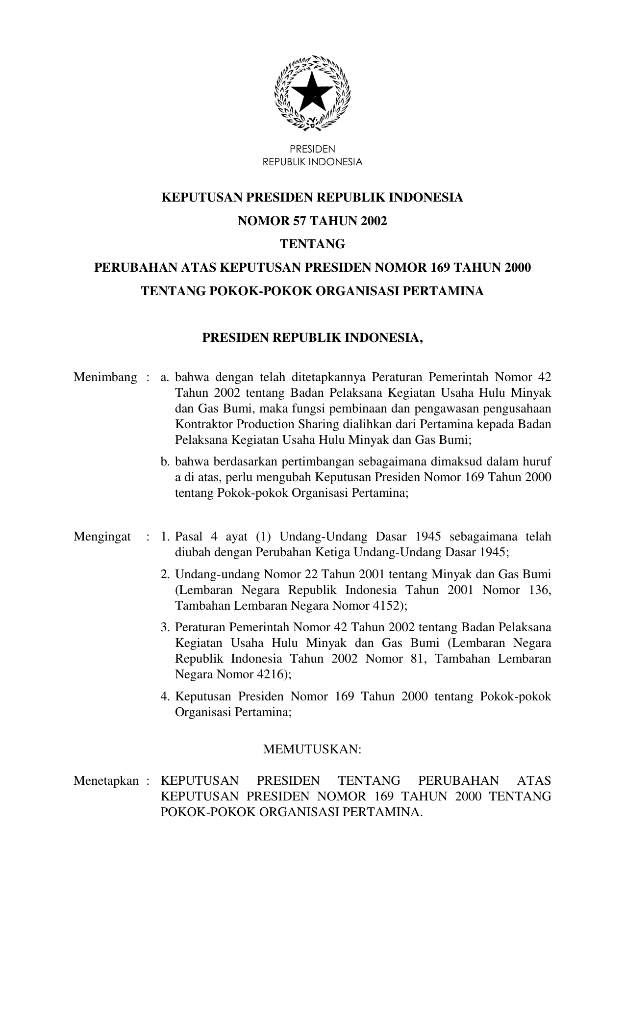 KEPPRES Nomor 57 Tahun 2002 | Keputusan Presiden Nomor 57 Tahun 2002 tentang PERUBAHAN KEPPRES 169-2000 TENTANG POKOK-POKOK ORGANISASI PERTAMINA