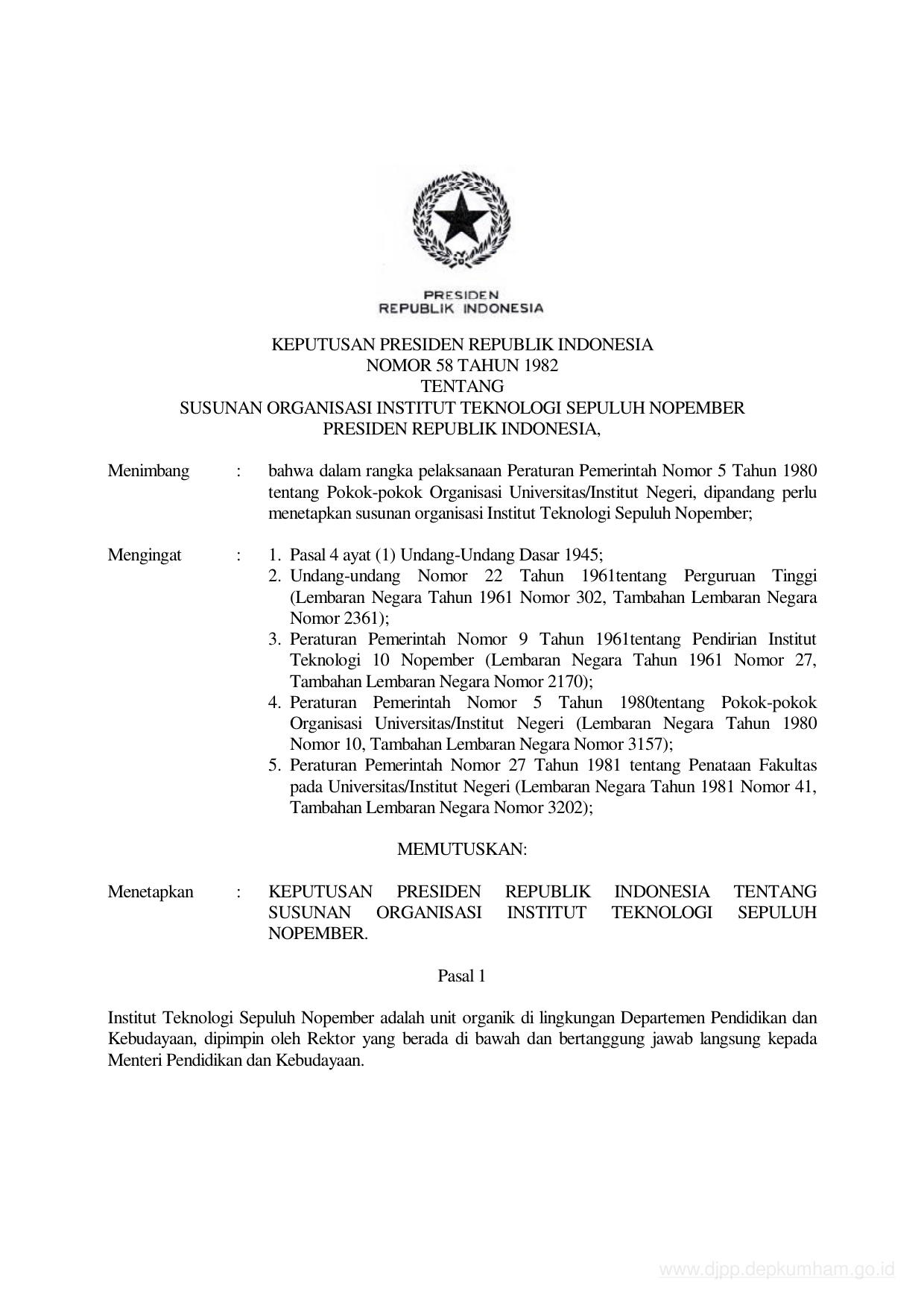 KEPPRES Nomor 58 Tahun 1982 | Keputusan Presiden Nomor 58 Tahun 1982 tentang SUSUNAN ORGANISASI INSTITUT TEKNOLOGI SEPULUH NOVEMBER