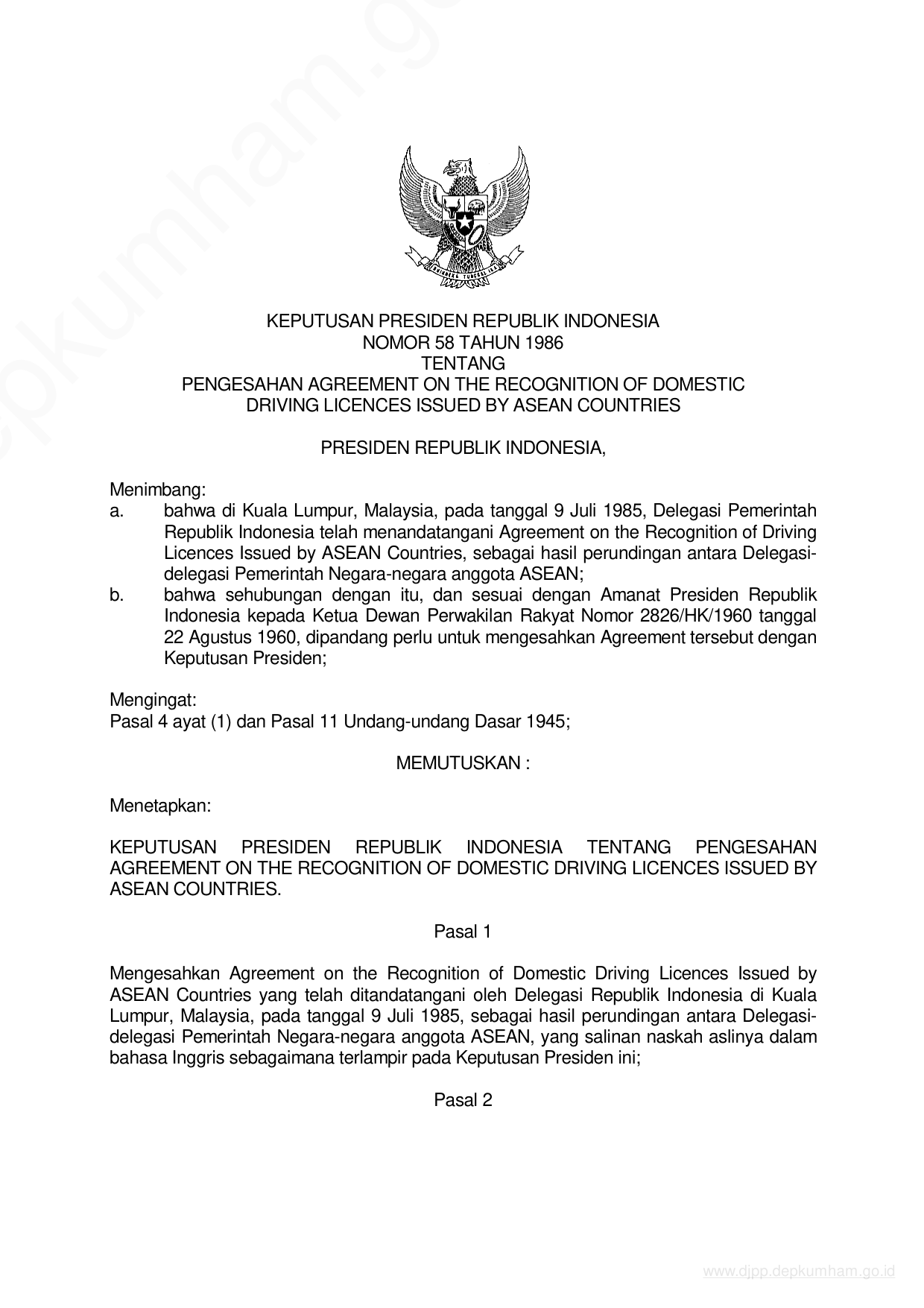 KEPPRES Nomor 58 Tahun 1986 | Keputusan Presiden Nomor 58 Tahun 1986 tentang PENGESAHAN AGREEMENT ON THE RECOGNITION OF DOMESTIC DRIVING LICENCES ISSUED BY ASEAN COUNTRIES
