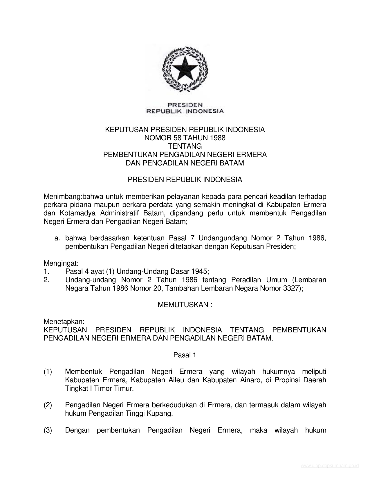 KEPPRES Nomor 58 Tahun 1988 | Keputusan Presiden Nomor 58 Tahun 1988 tentang PEMBENTUKAN PENGADILAN NEGERI ERMERA DAN PENGADILA NEGERI BATAM
