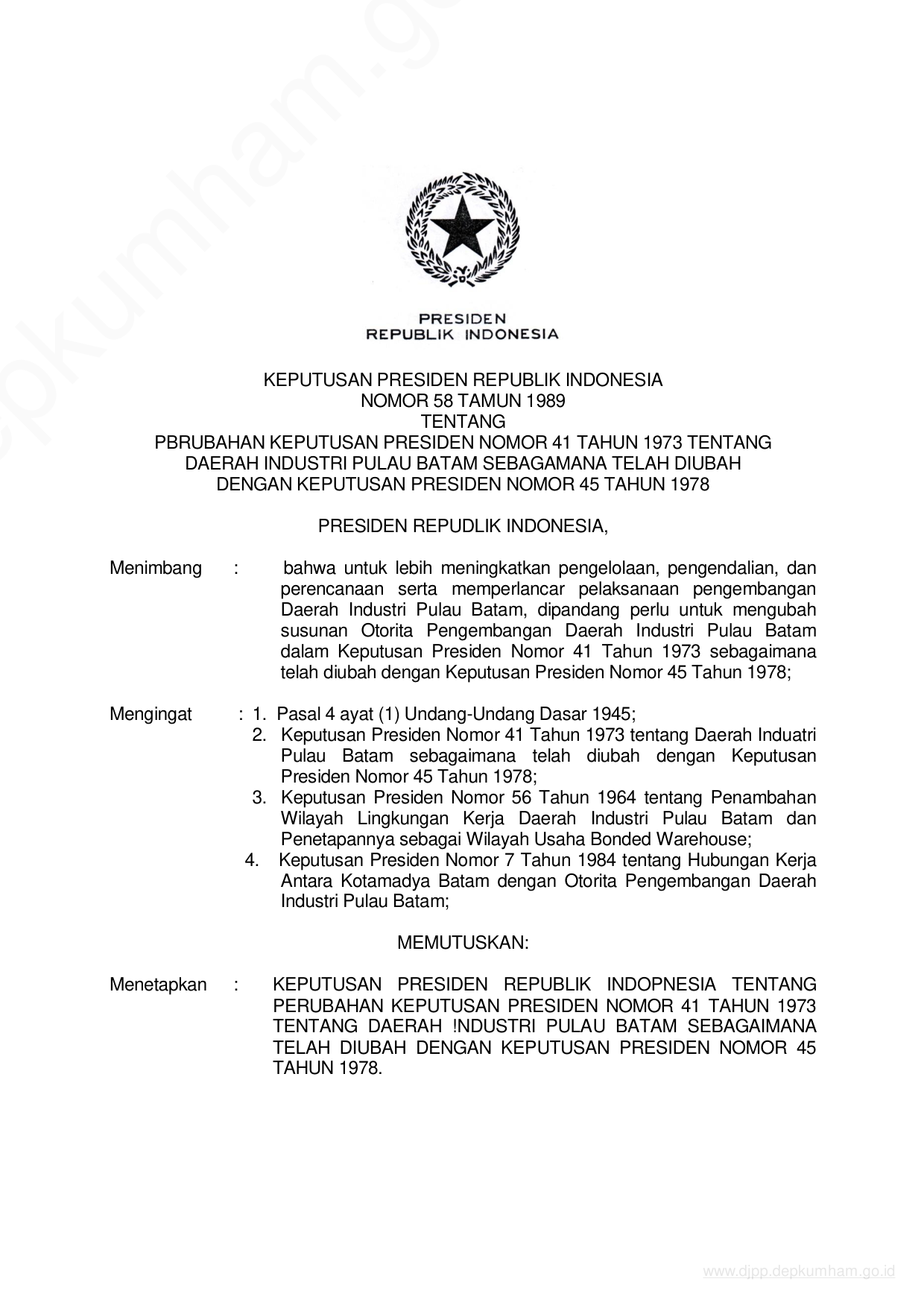 KEPPRES Nomor 58 Tahun 1989 | Keputusan Presiden Nomor 58 Tahun 1989 tentang PERUBAHAN KEPUTUSAN PRESIDEN NOMOR 41 TAHUN 1973 TENTANG DAERAH INDUSTRI PULAU BATAM SEBAGAIMANA TELAH DIUBAH DENGAN KEPUTUSAN PRESIDEN NOMOR 45 TAHUN 1978