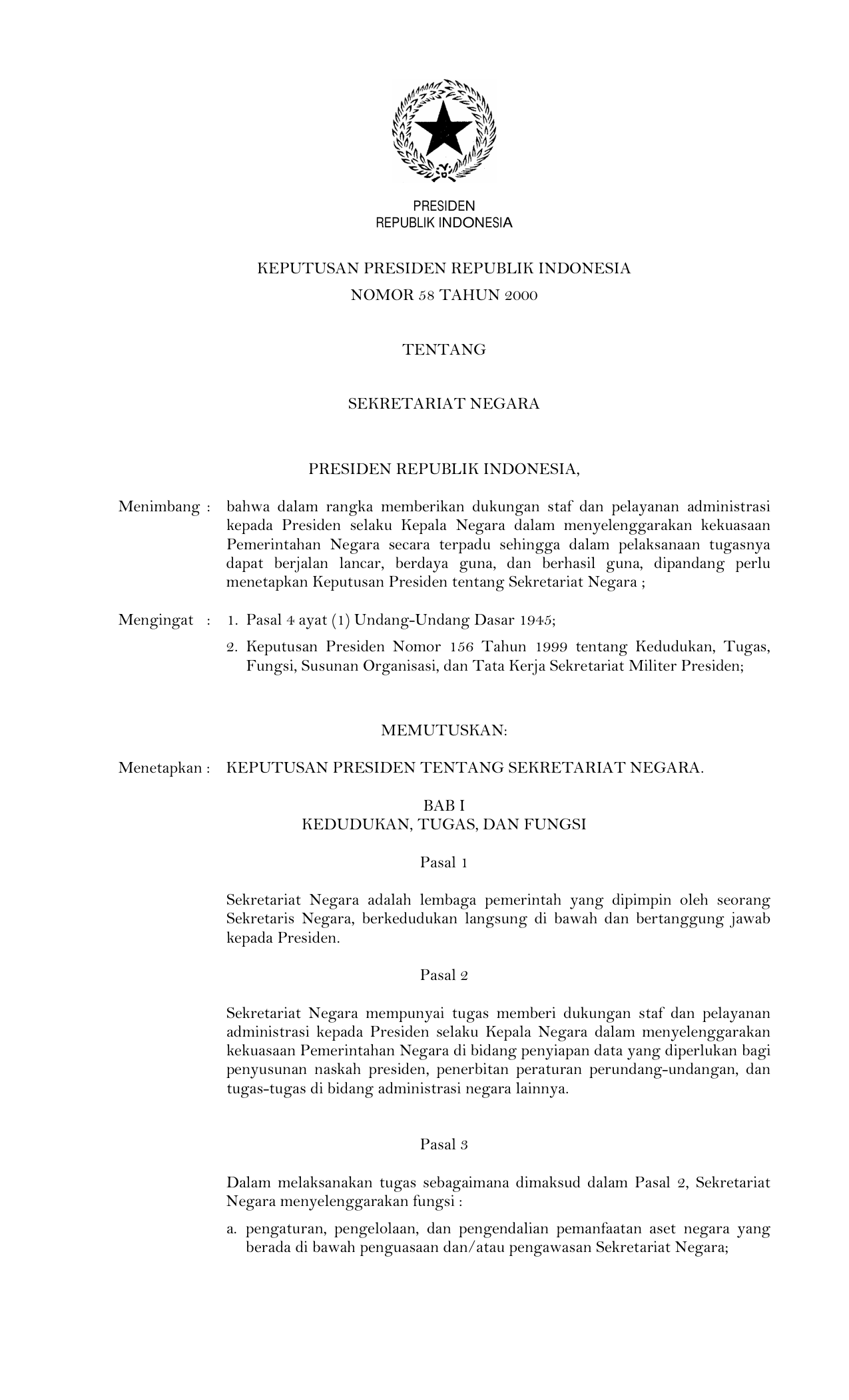 KEPPRES Nomor 58 Tahun 2000 | Keputusan Presiden Nomor 58 Tahun 2000 tentang SEKRETARIAT NEGARA