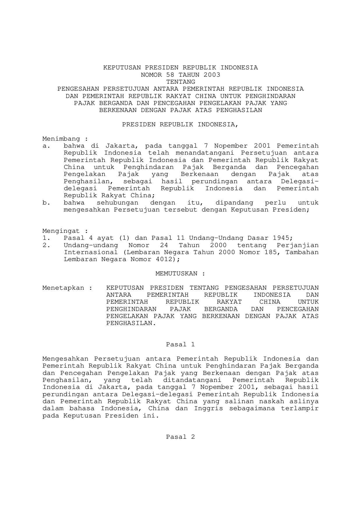 KEPPRES Nomor 58 Tahun 2003 | Keputusan Presiden Nomor 58 Tahun 2003 tentang PENGESAHAN PERSETUJUAN ANTARA PEMERINTAH RI DAN PEMERINTAH REPUBLIK RAKYAT CHINA UNTUK PENGHINDARAN PAJAK BERGANDA DAN PENCEGAHAN PENGELAKAN PAJAK YANG BERKENAAN DENGAN PAJAK ATAS PENGHASILAN