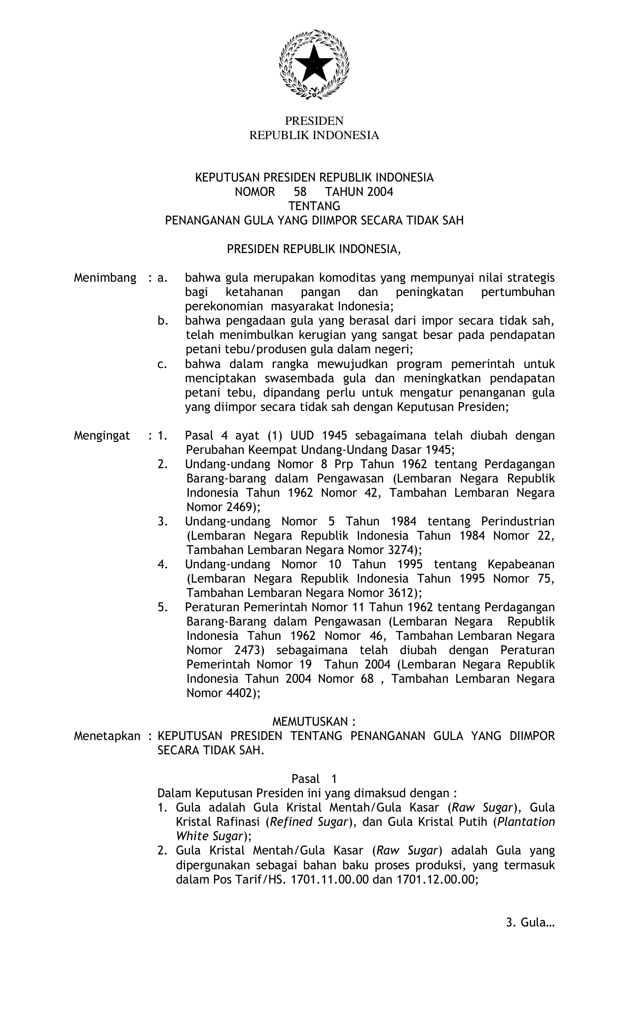 KEPPRES Nomor 58 Tahun 2004 | Keputusan Presiden Nomor 58 Tahun 2004 tentang PENANGANAN GULA YANG DIIMPOR SECARA TIDAK SAH