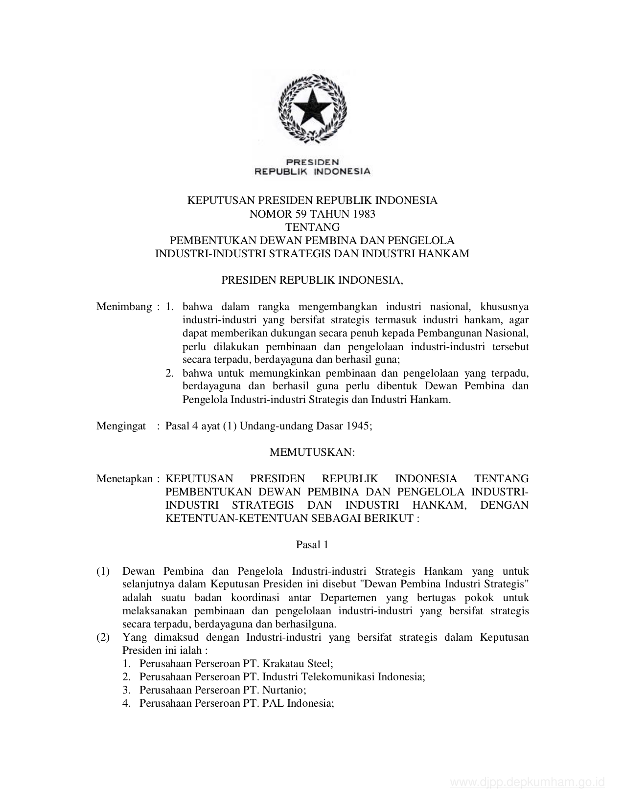 KEPPRES Nomor 59 Tahun 1983 | Keputusan Presiden Nomor 59 Tahun 1983 tentang PEMBENTUKAN DEWAN PEMBINA DAN PENGELOLA INDUSTRI- INDUSTRI STRATEGIS DAN INDUSTRI PERTAHANAN KEAMANAN