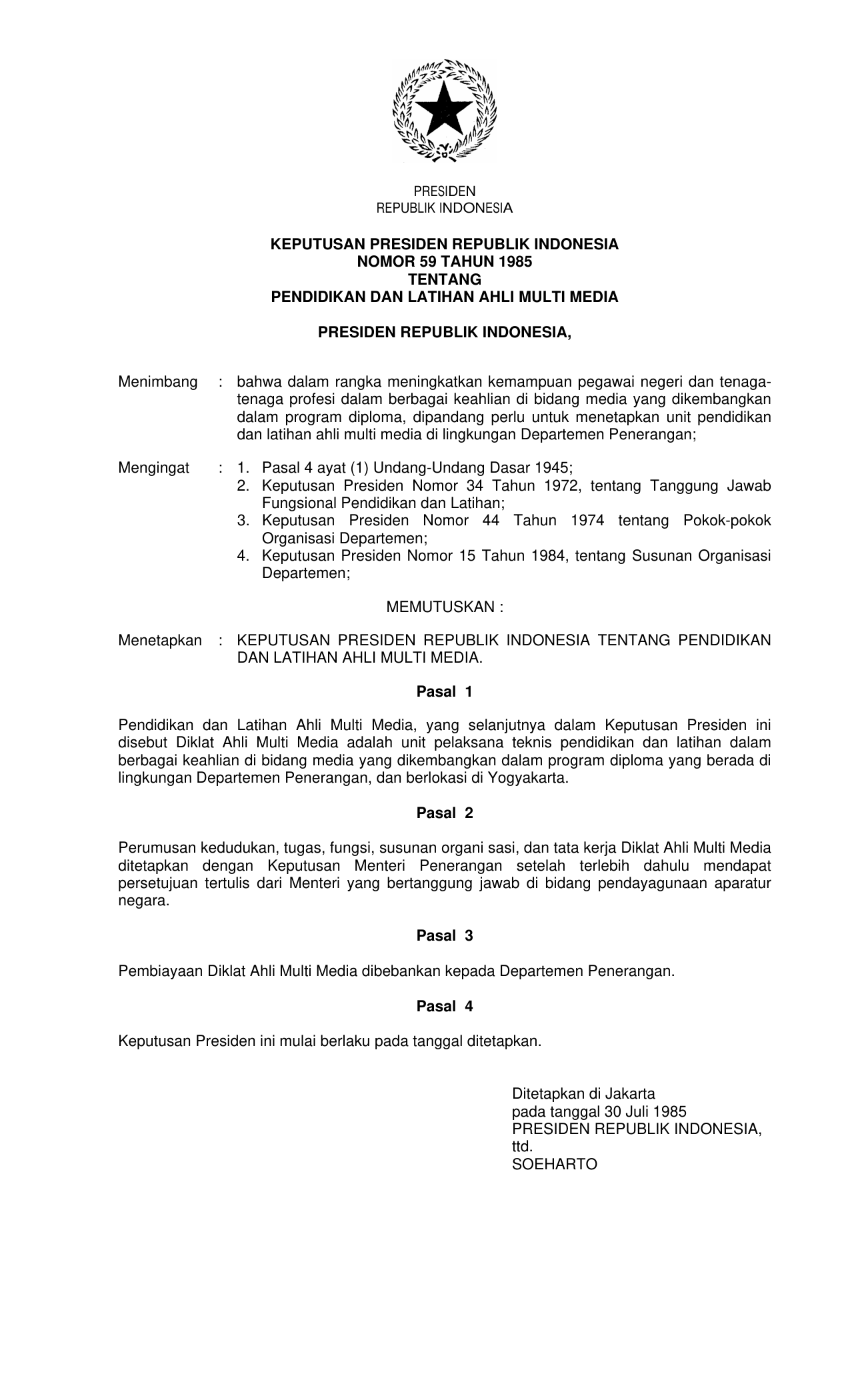 KEPPRES Nomor 59 Tahun 1985 | Keputusan Presiden Nomor 59 Tahun 1985 tentang PENDIDIKAN DAN PELATIHAN AHLI MULTI MEDIA