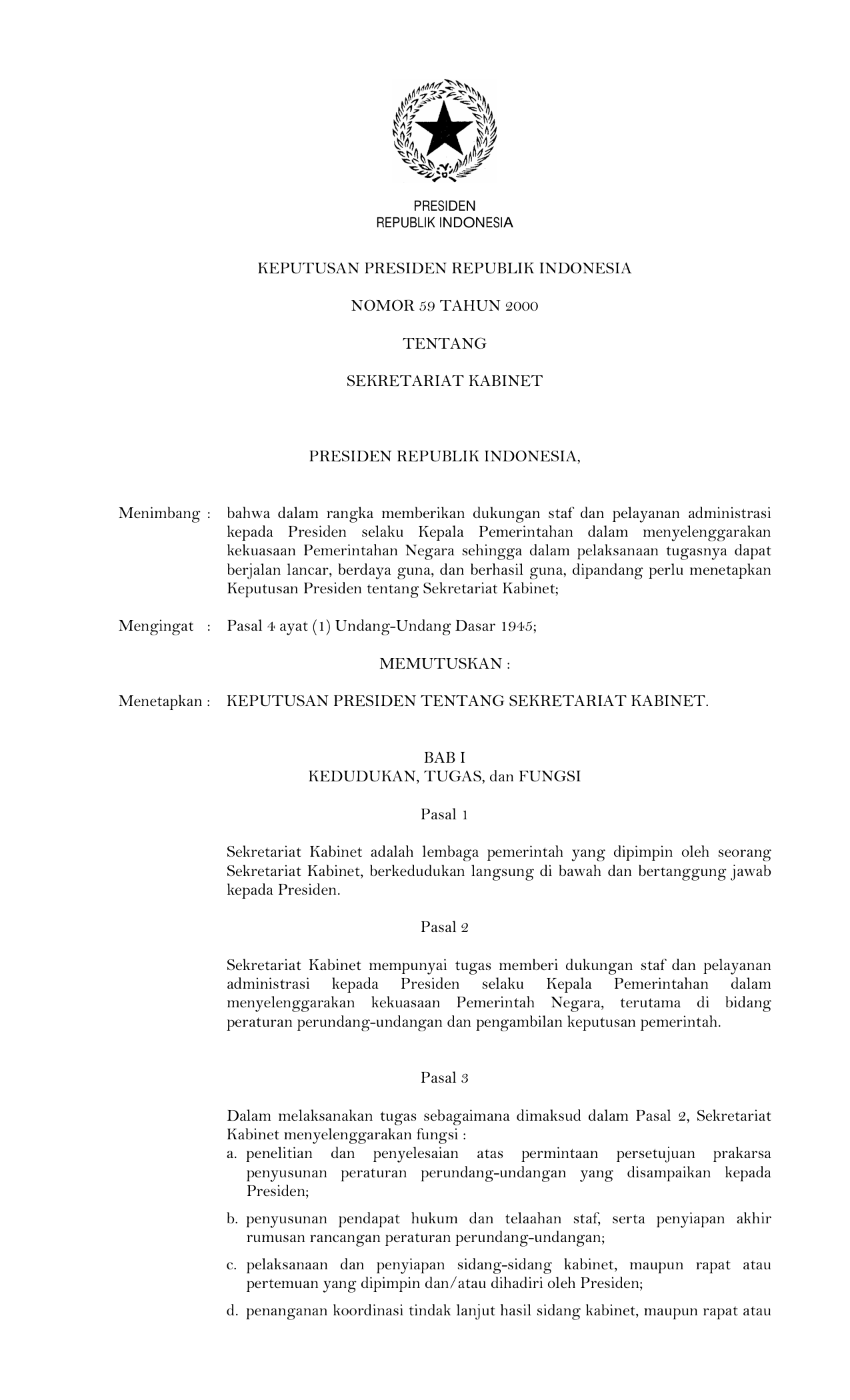 KEPPRES Nomor 59 Tahun 2000 | Keputusan Presiden Nomor 59 Tahun 2000 tentang SEKRETARIAT KABINET