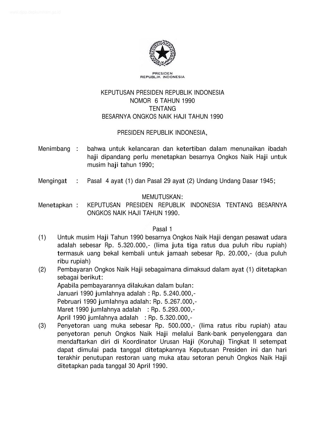 KEPPRES Nomor 6 Tahun 1990 | Keputusan Presiden Nomor 6 Tahun 1990 tentang BESARNYA ONGKOS NAIK HAJI TAHUN 1990